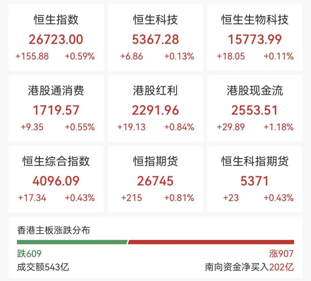 2月16日上午,港股市场低开后震荡拉升,截至收盘,恒生指数涨0.59%,恒生科技指数涨0.13%,恒生国企指数涨0.56%。