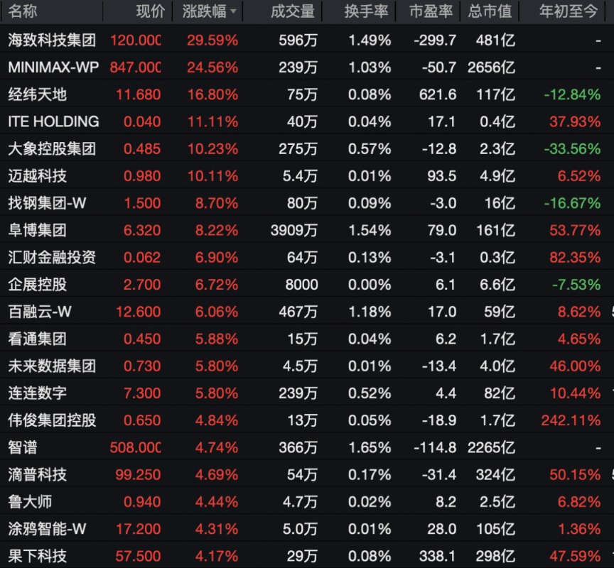 AI应用概念股延续涨势,海致科技集团大涨约30%,MINIMAX-WP、经纬天地、阜博集团、智谱等涨幅居前。