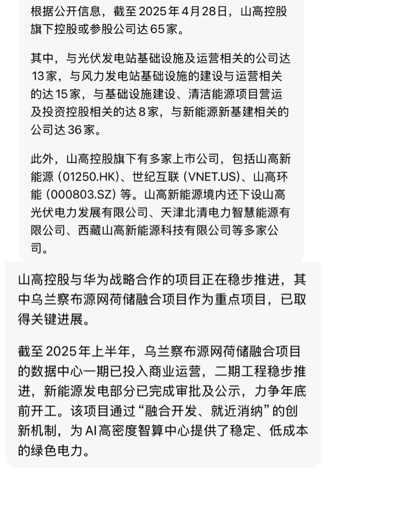 $山高控股(HK|00412)$ 参股控股的企业还挺多,等公告引华为战略入股加上乌兰察布源网荷储融合项目的数据中心二期工程开工消息翻倍又翻倍