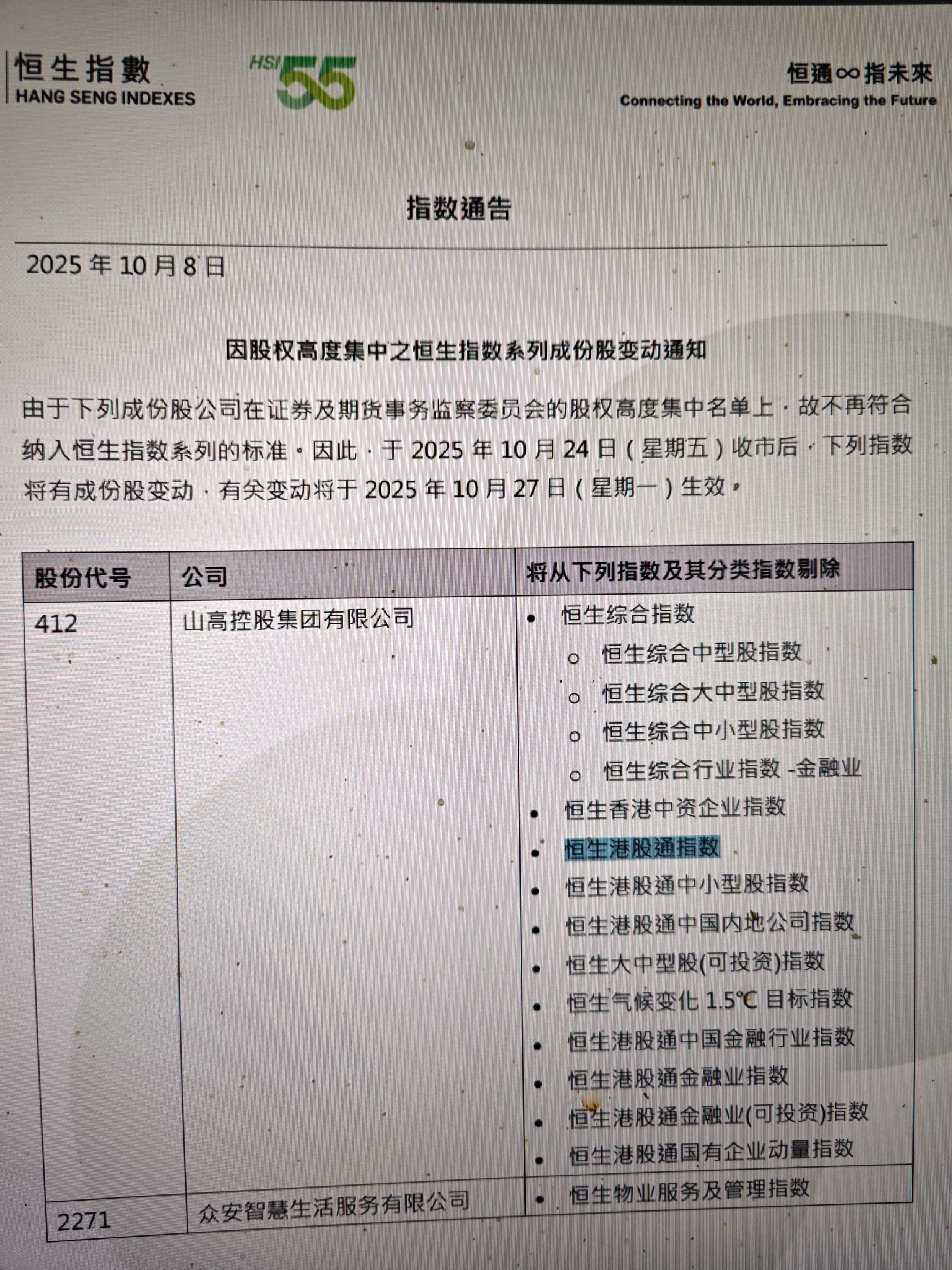 $山高控股(HK|00412)$ 统一扫盲贴,确定的是一定会退出港股通,生效时间是10月24号,还有十几天。