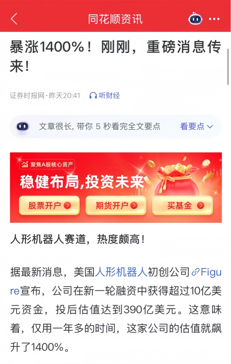 $山高控股(HK|00412)$ Figure 03人形机器人赛道,热度颇高!据最新消息,美国人形机器人初创公司Figure宣布,公司在新一轮融资中获得超过10亿美元资金,投后估值达到390亿美元。这意味着,仅用一年多的时间,这家公司的估值就飙升了1400%。