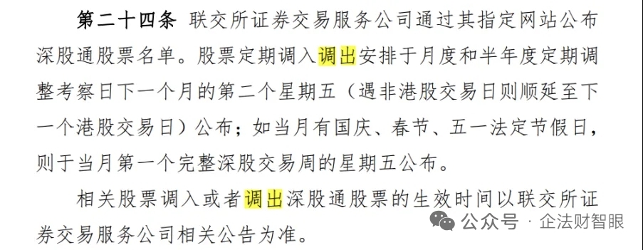 $山高控股(HK|00412)$ 关于港股通交易的退出时间问题,需要详细解读相关法规和市场实践。根据《上海证券交易所沪港通业务实施办法》的明确规定,股票调入或调出深股通的具体生效时间,必须依据香港联合交易所证券交易服务公司发布的官方公告来确定。在过往可查询的历史案例中,股票从港股通中退出的时间通常是在该股票从相关指数中移出后的下一个交易日,这一信息会由上海证券交易所和深圳证券交易所联合发布公告予以确认。然而,具体的生效日期最终以实际公告日为准,这体现了监管的灵活性和不确定性。