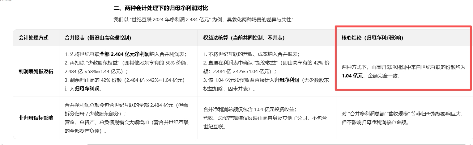 大家又来学习新知识了,今天学习山高控股对世纪互联并表与否对归母净利润的影响。结论