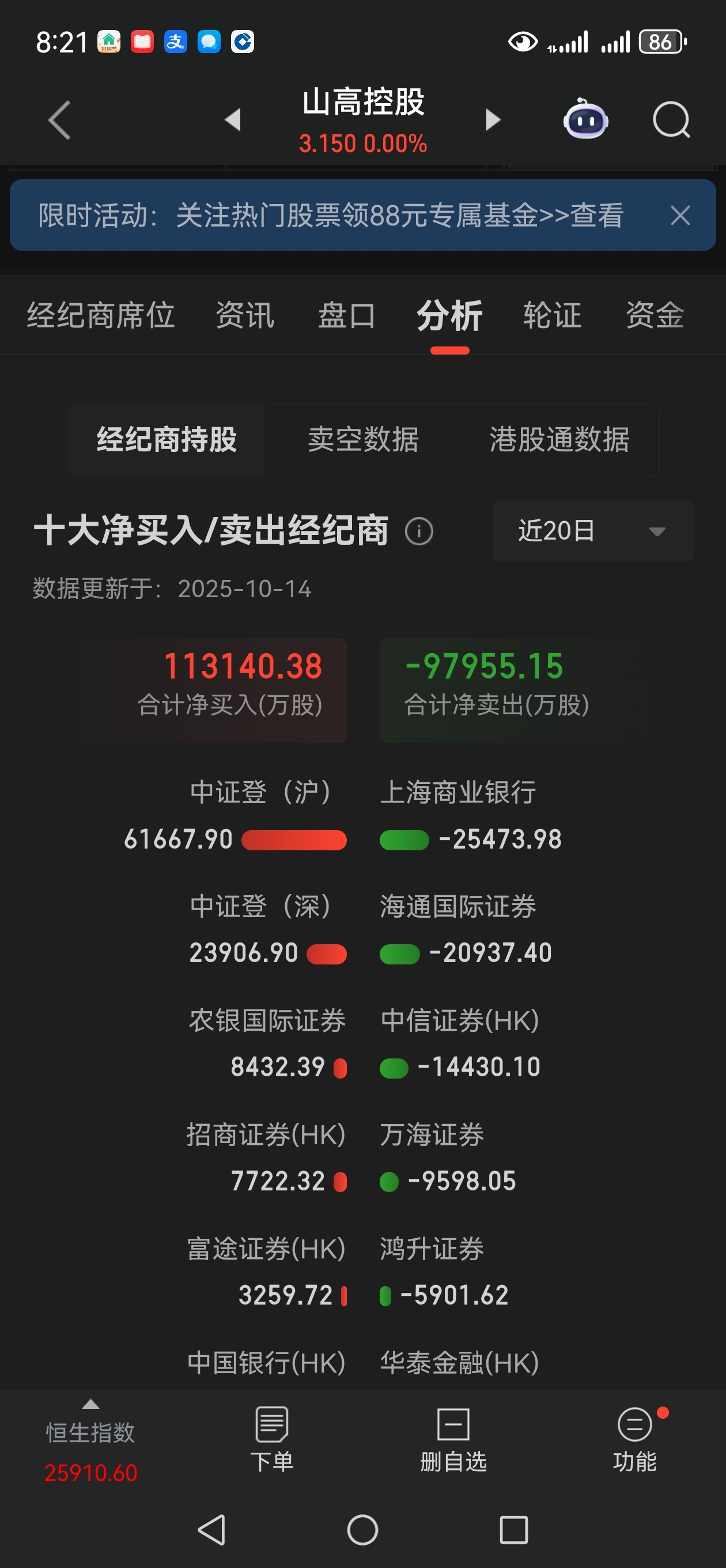 $山高控股(HK|00412)$ 港股通一共买入8亿股那来转仓26亿股。乱扯。那16%就是港股通买的