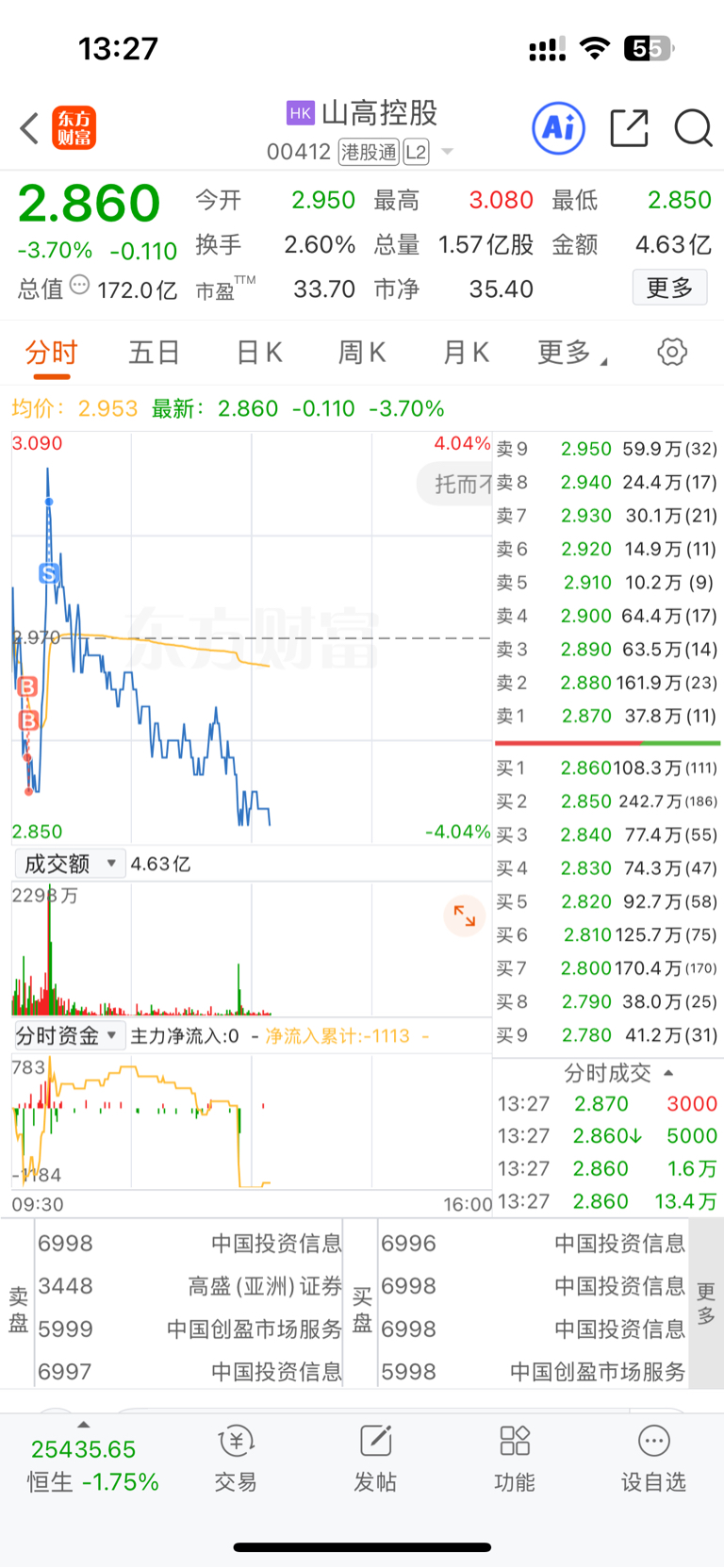 $山高控股(HK|00412)$ 还有人笑话财姐没格局吗?今天估计还会尾盘暴跌!大家注意风险!