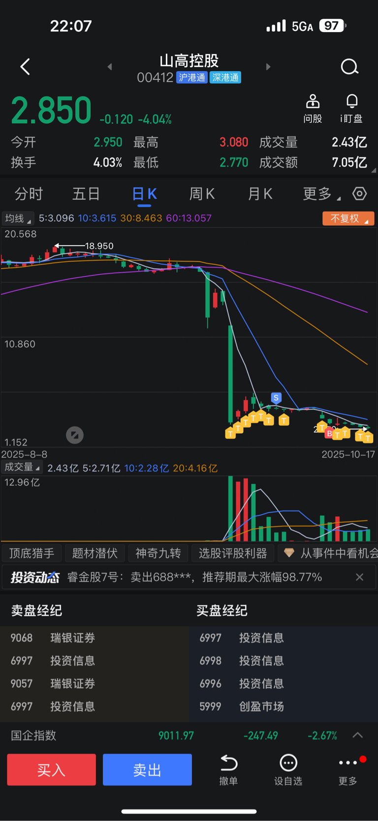 $山高控股(HK|00412)$ 谁有我拿的天数多的,不离不弃。9月19日那天4.52买的(亏35个点)第二个工作日踢了还赚了一点。第三天赚了25个点。直到现在倒亏35个点