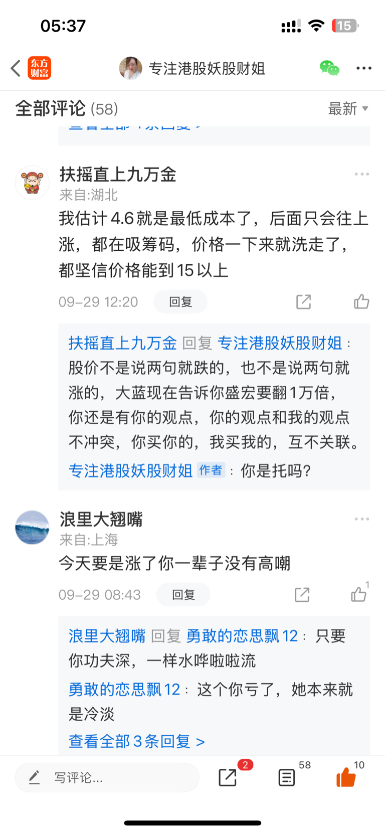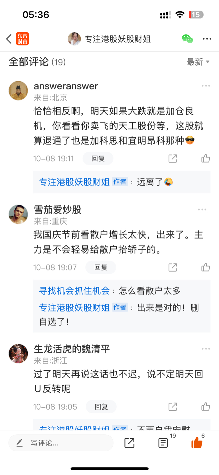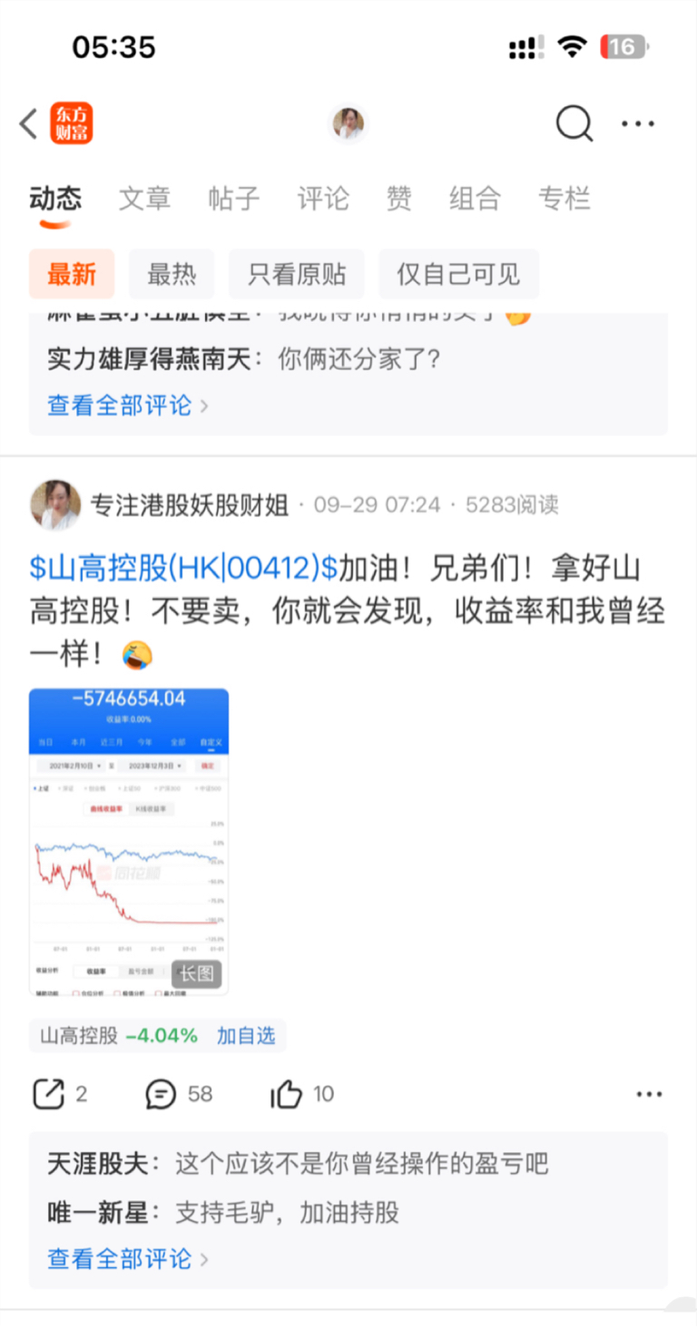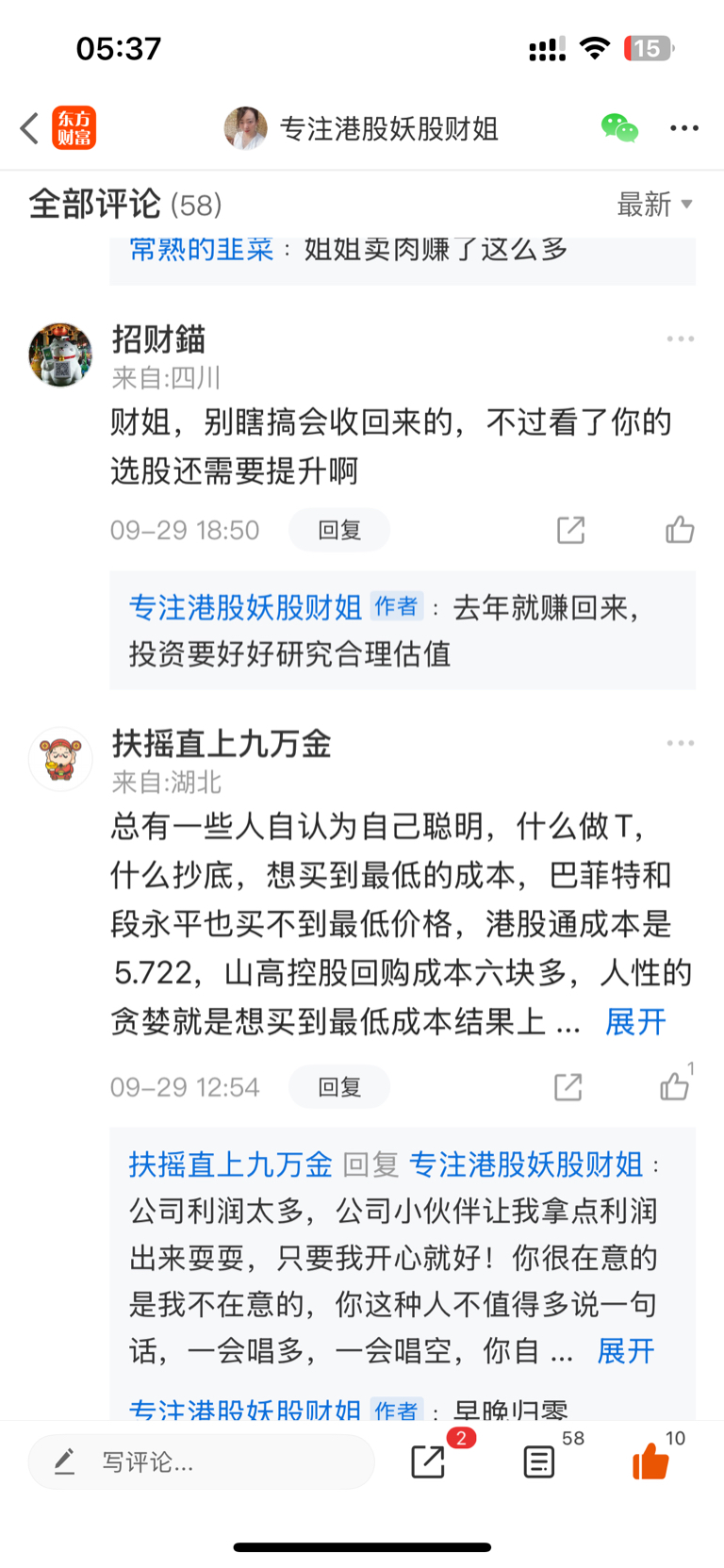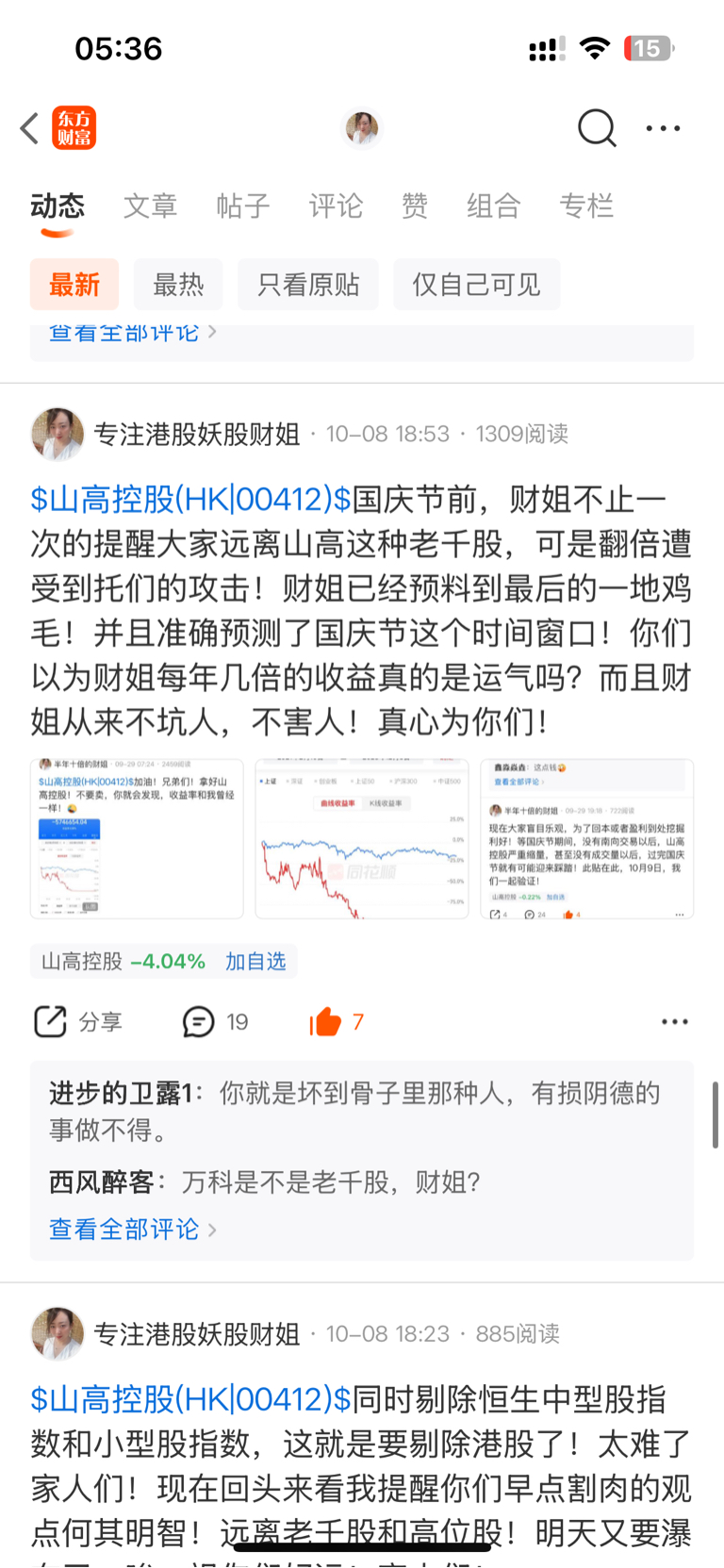 $山高控股(HK|00412)$ 国庆节前和国庆后,财姐不止一次的提醒大家远离山高这种老千股,可是遭受到托们的攻击!财姐已经预料到最后的一地鸡毛!并且准确预测了国庆节这个时间窗口!你们以为财姐每年几倍的收益真的是运气吗?而且财姐从来不坑人,不害人!真心为你们!