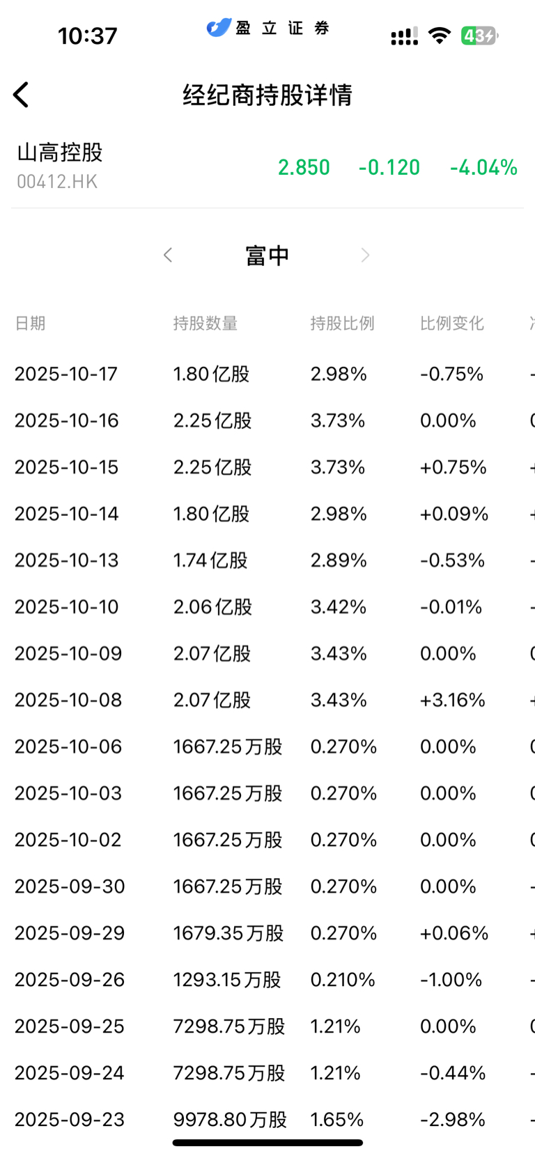 $山高控股(HK|00412)$ 富中真是的专业卖货人,老庄从海通证券转存到富中2亿多股继续卖,怪不得这几天大跌?还有就是嘉实基金在上海商业银行的股份为啥也卖了?大家一起理性分析下,我周五抄底了,瑟瑟发抖,无脑超多和无脑唱空的,庄托不要评论,评论拉黑,只欢迎技术派!