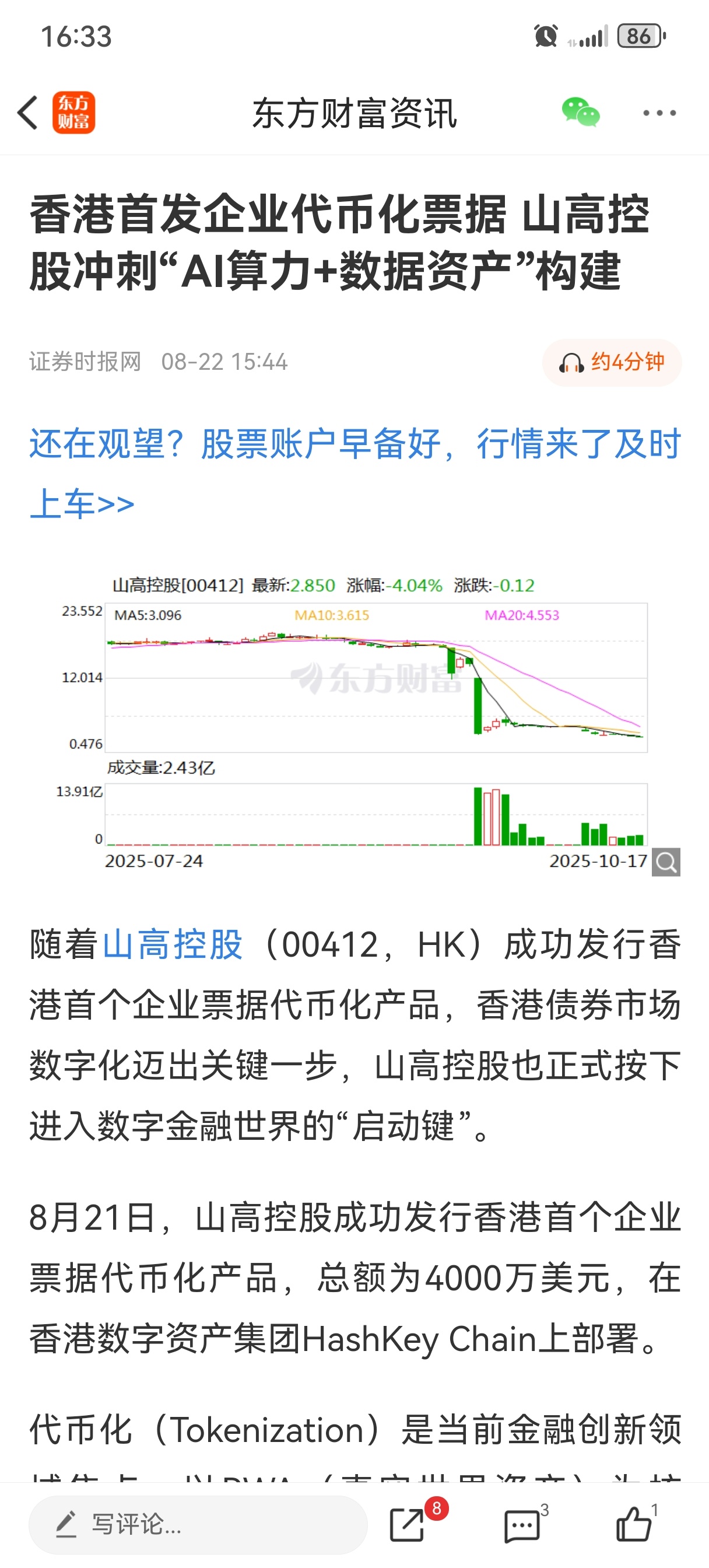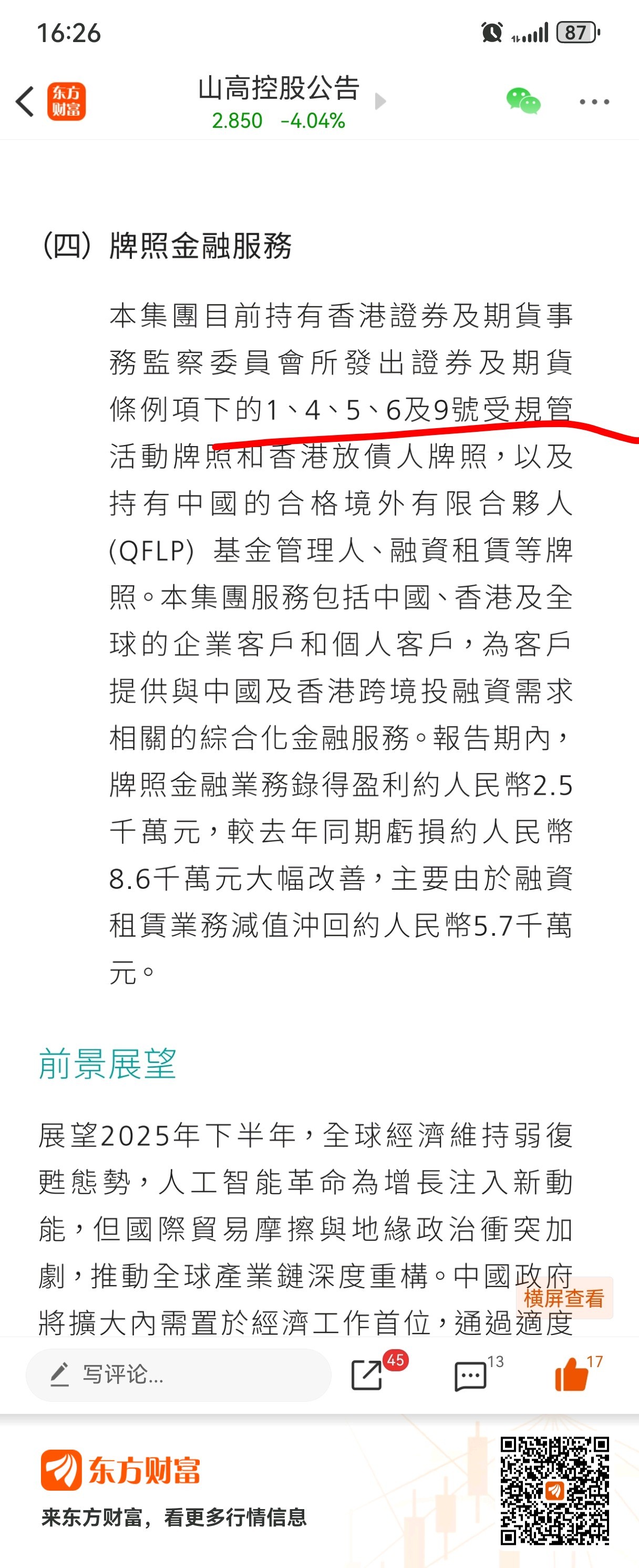 毛驴,你还自称老师,根本不做功课,山高控股的前身是中国新金融集团,很早就有1、4、5、6、9号全牌照,山高控股也是香港第一个发行rwa的公司,比德林早多了。都是老千股,山高是大千,德林是小千。炒虚拟牌照已经过时了!!!回头是岸,我在佰泽医疗等你!$山高控股(HK|00412)$$佰泽医疗(HK|02609)$$德林控股(HK|01709)$