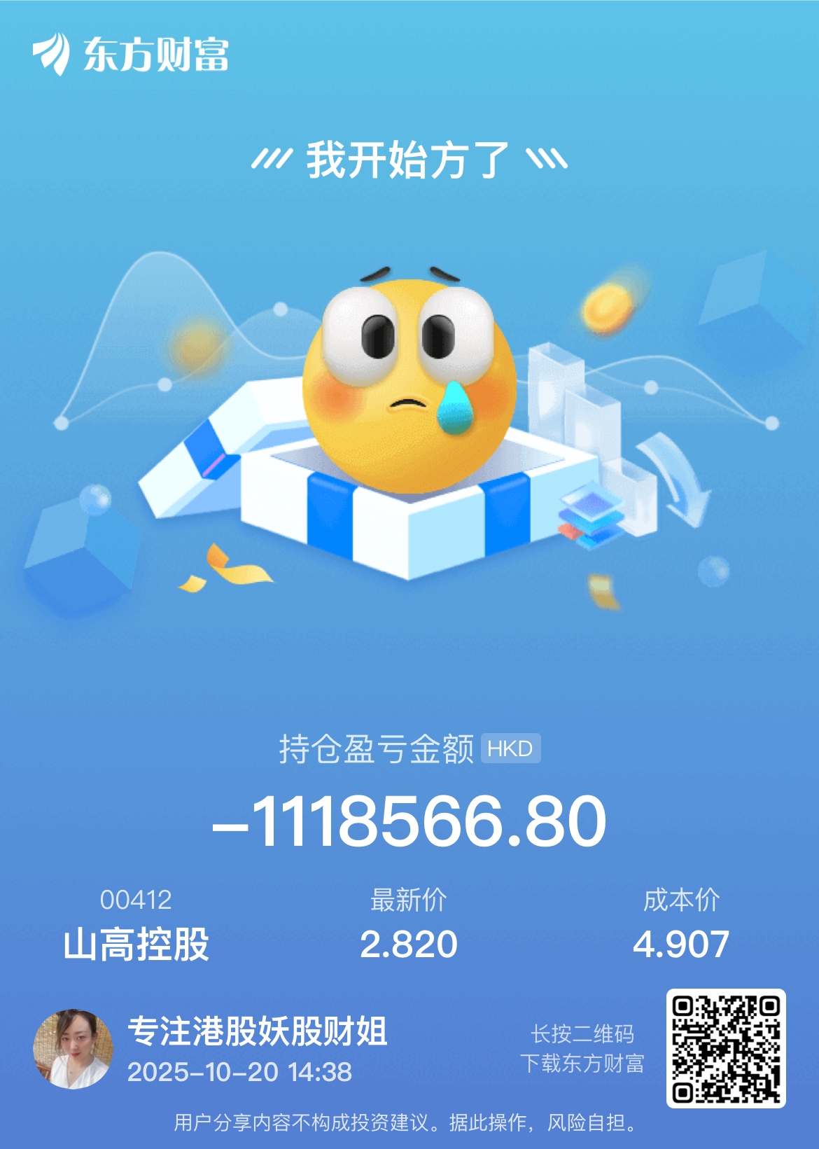 $山高控股(HK|00412)$ 股吧的v5都割肉了,v4都变v3了!我可要挺住!带领大家,关注我,看我本金如何归零!