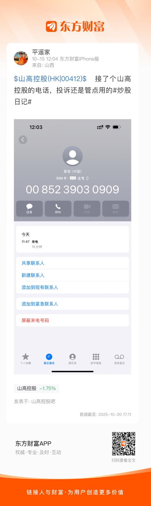 $山高控股(HK|00412)$   接了个山高控股的电话,投诉还是管点用的#炒股日记#