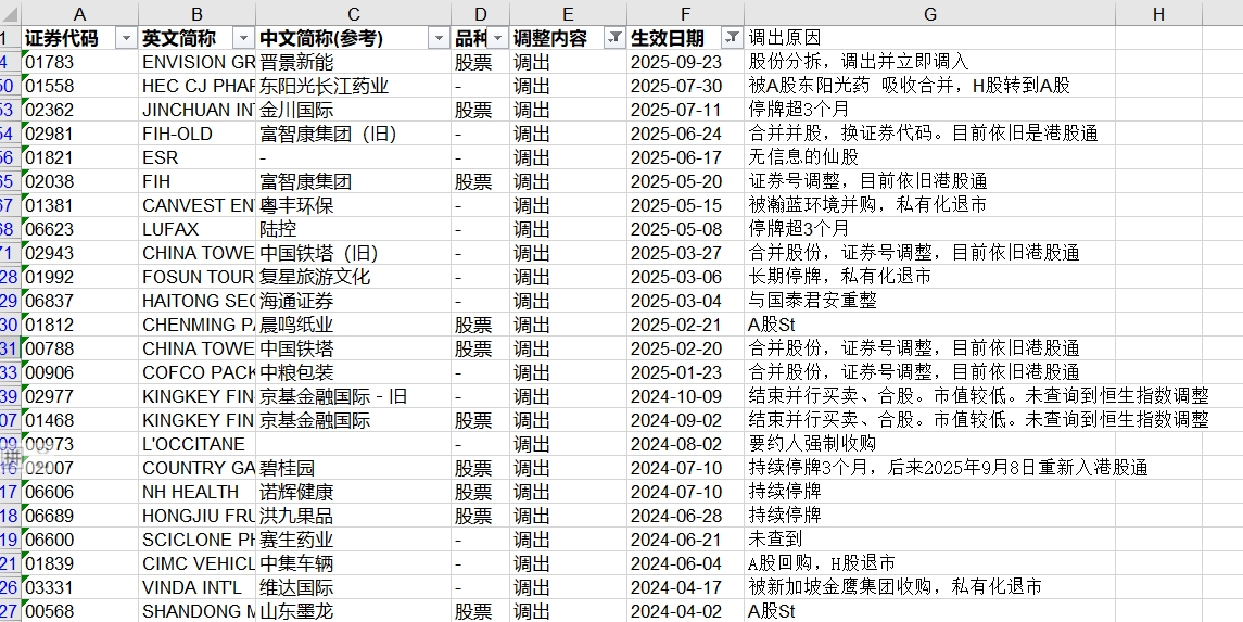 2.上海交易所可以查询港股通调整记录,可以下载,筛选一下,看看非3月和9月统一调整的股都是什么原因调出的。这里是我总结的。