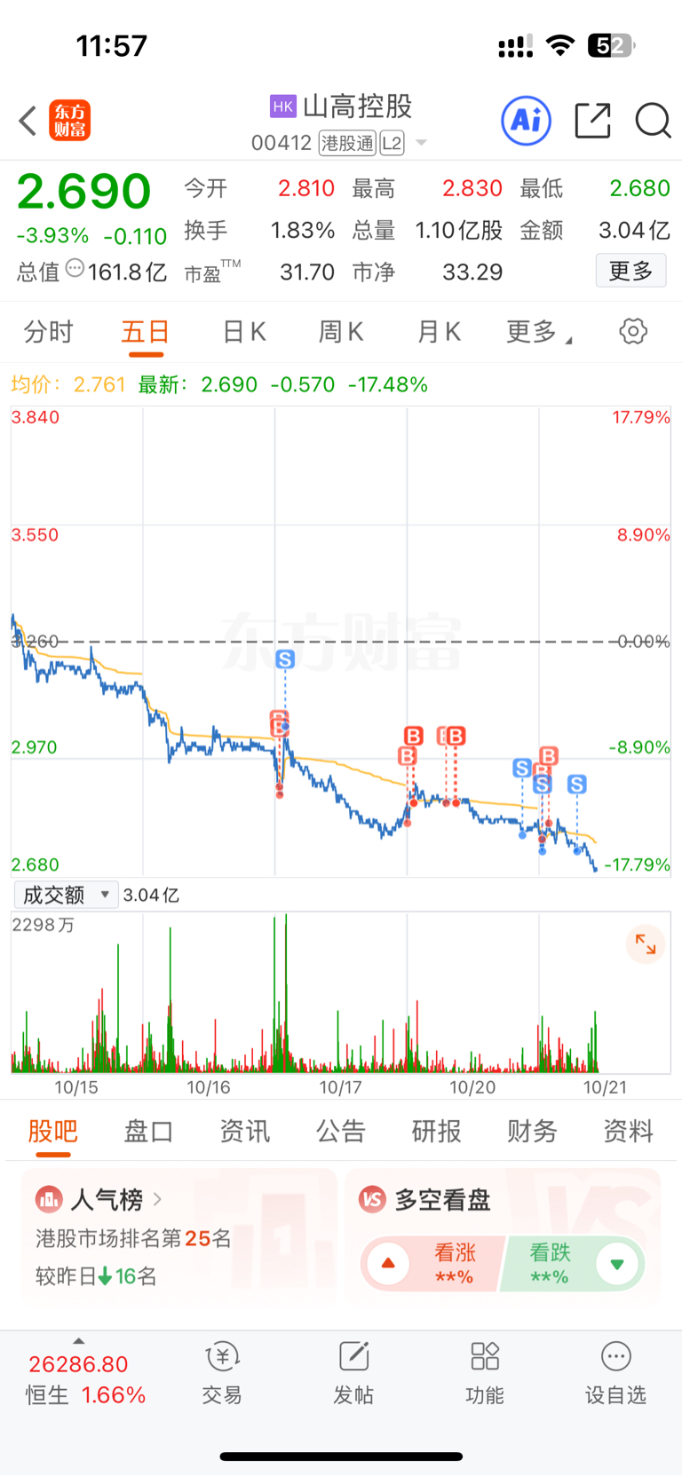 $山高控股(HK|00412)$ 连续抄底三天,总计亏损8.6万!每次都是 150万左右的交易额!博弈失败,距离下周一退通太近了,拉升可能几乎没有了,可能下杀式继续出货,谨慎参与,建议不参与!