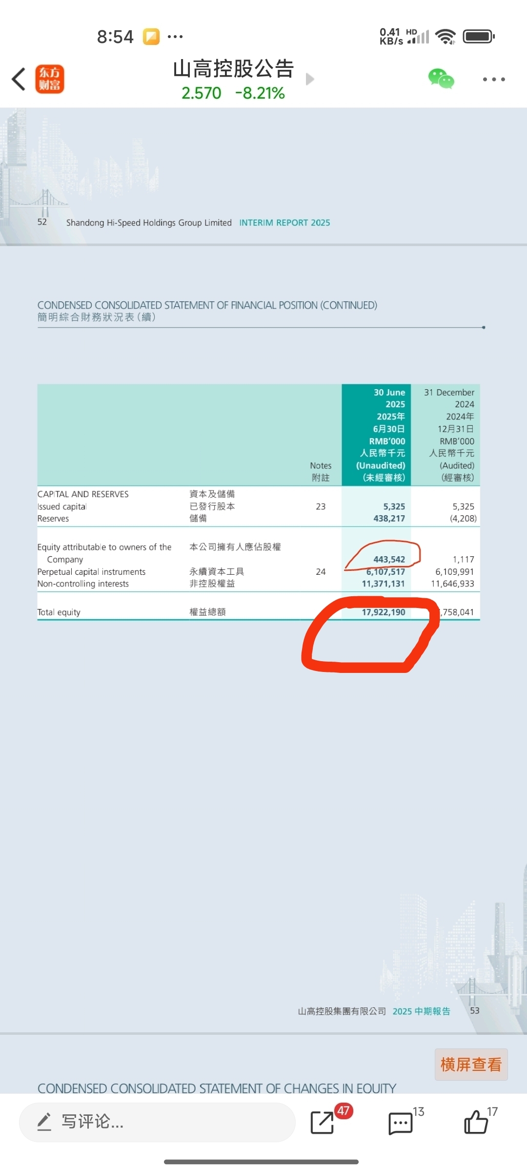 这是家什么公司,集团净资产权益总额为179亿,而本公司拥有人应占股权益4.4亿。97%以上的权益为资本工具方,和非控股方。怪不的利润总额5亿多,本公司仅分4700万。这样的公司能值几个亿。