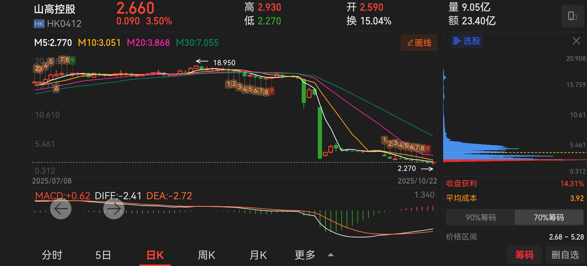 $山高控股(HK|00412)$ 今天筹码分布,算是有较多获利筹码了,从获利筹码看, 获利筹码并没有出货,说明今天主力是真拉升,不是拉高出货。明天肯定高开高走。