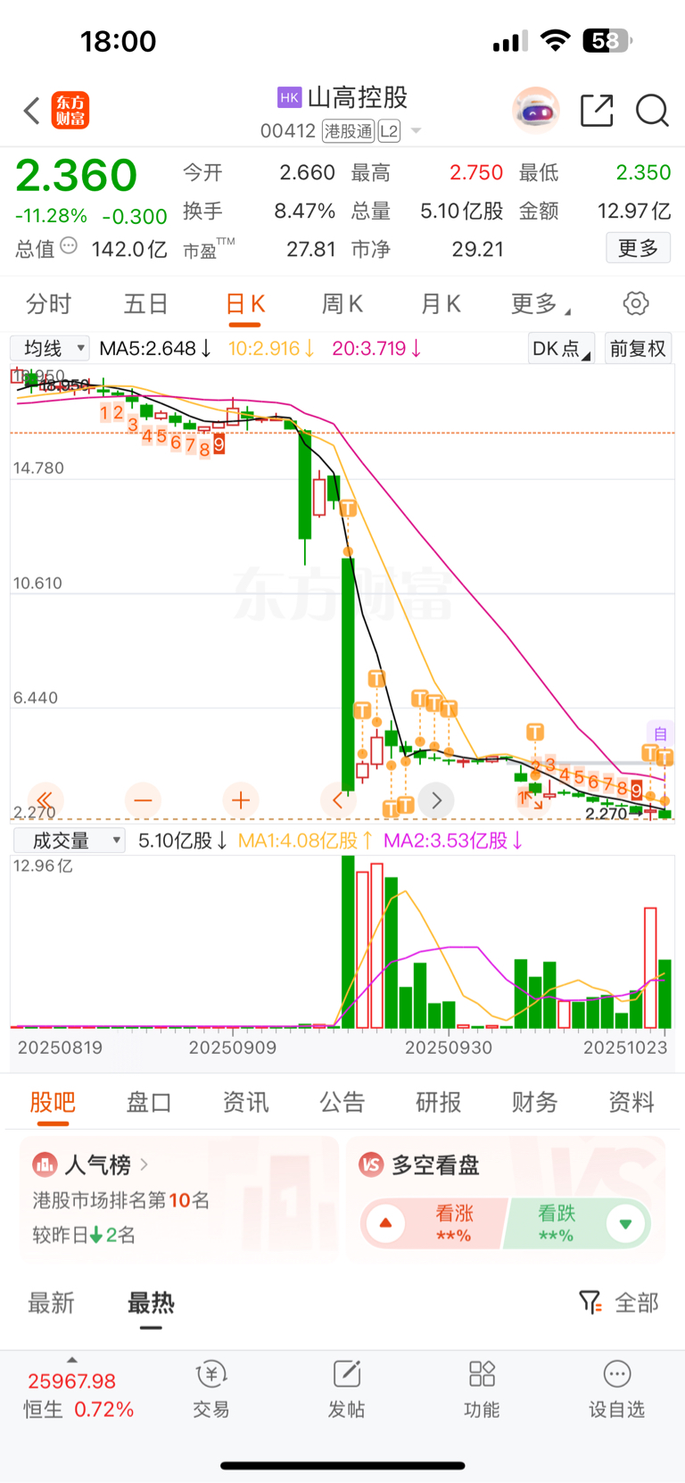 $山高控股(HK|00412)$ 从盈利4万到亏损6万,今天清了删了自选,希望能涨到100,祝各位早日脱离苦海。