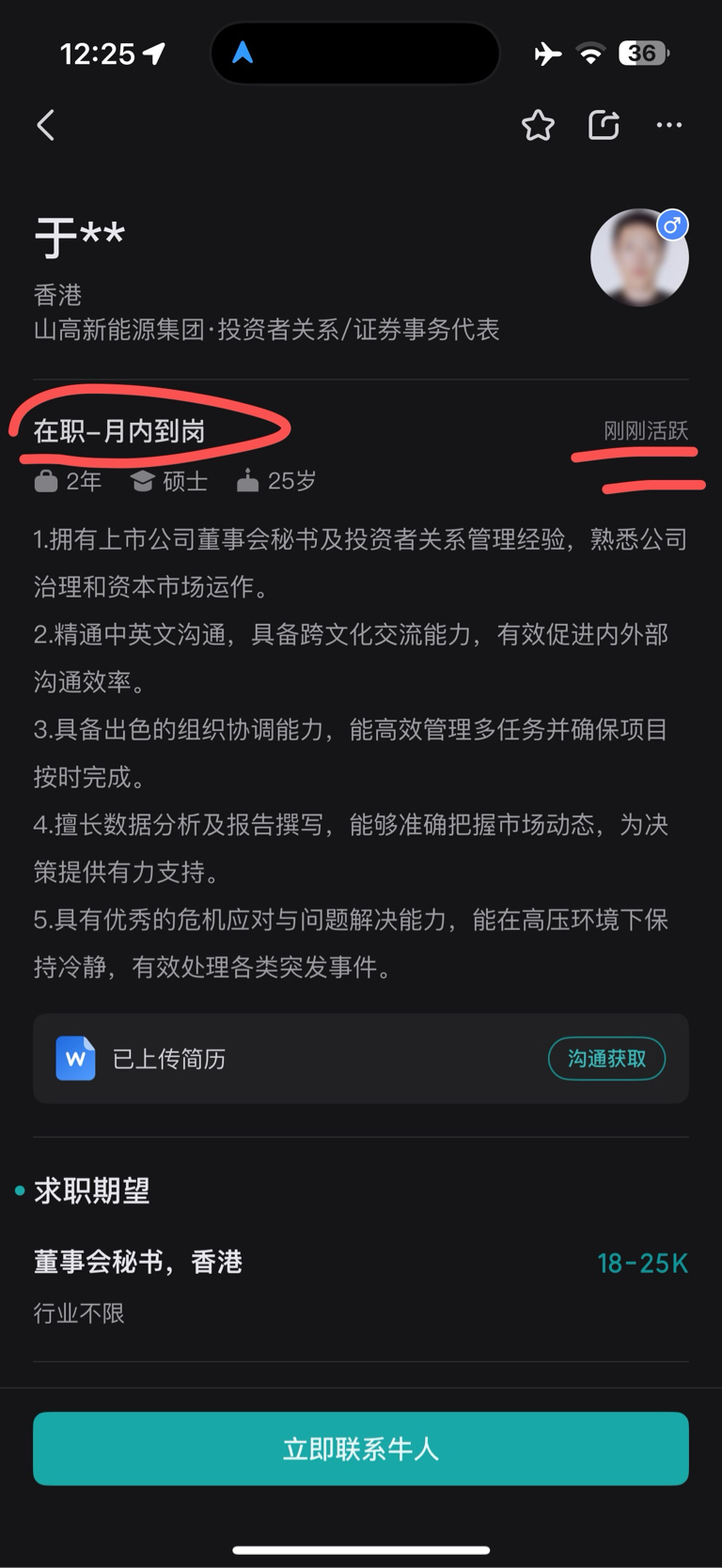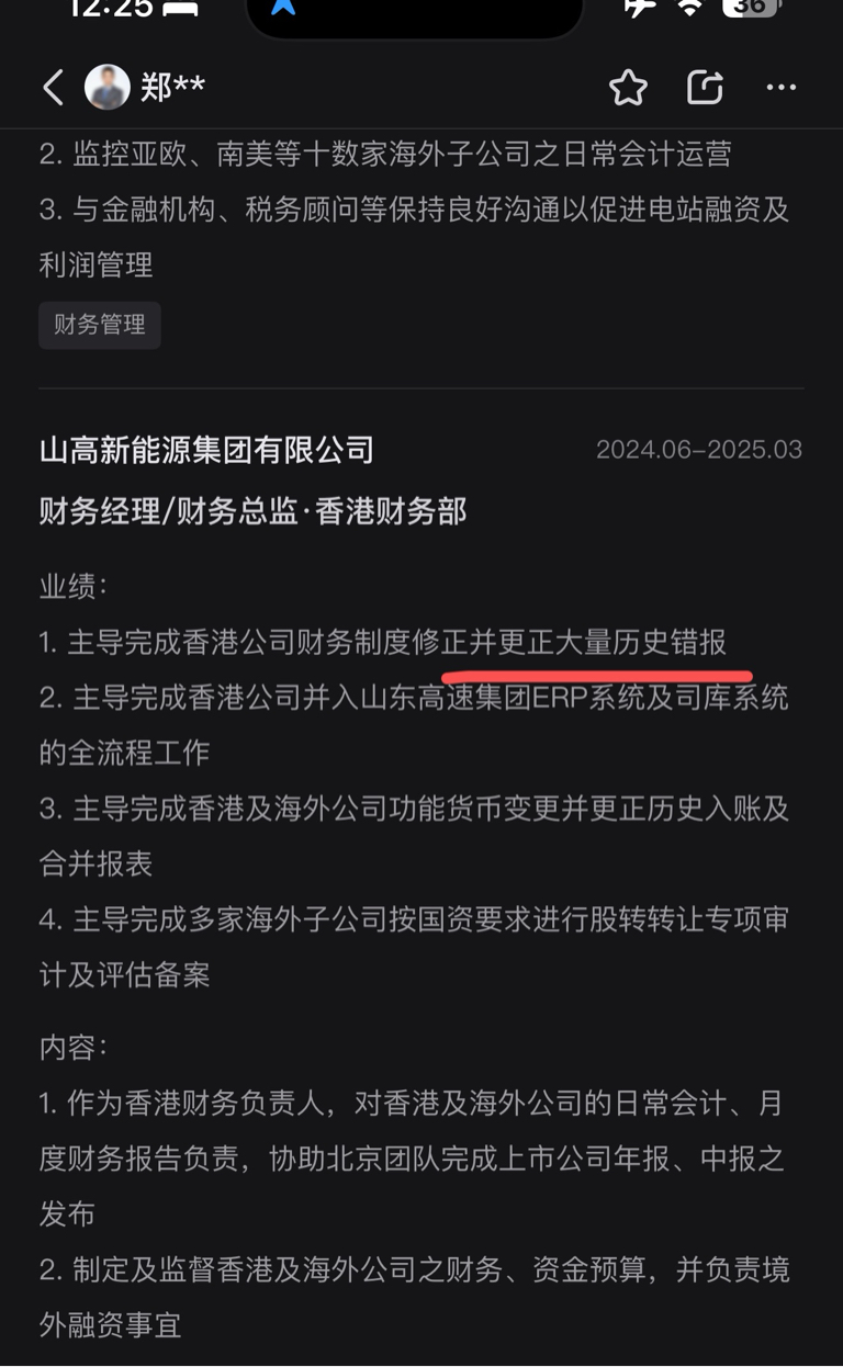 $山高控股(HK|00412)$ 分享一些发现。1、招聘网站上搜到不少准备从山高跳槽的员工,包括一直不发公告被公众投诉到电话打爆的ir小伙子,也活跃在招聘场所。2、前财务总监今年三月份跳槽,简历写道其参与更正大量历史错报。怀疑和山高是不是有仇?上市公司财务大量出错被写在简历里公之于众?不得而知,希望山高至少出面回应一下。