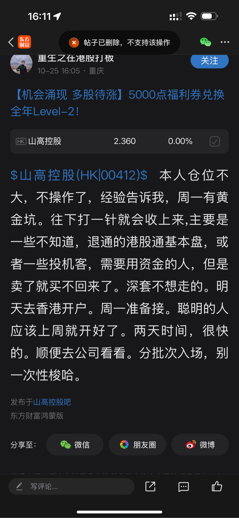 $山高控股(HK|00412)$ @重生之在港股打板 山高托,这次准备骗人来开香港户了?现在国内人能不能开你不懂吗?9月新闻不看?人家被你骗来了白跑一趟你报销吗?所以说你帮老千做托要认真学习,别懂一半又不懂的,容易被人笑。