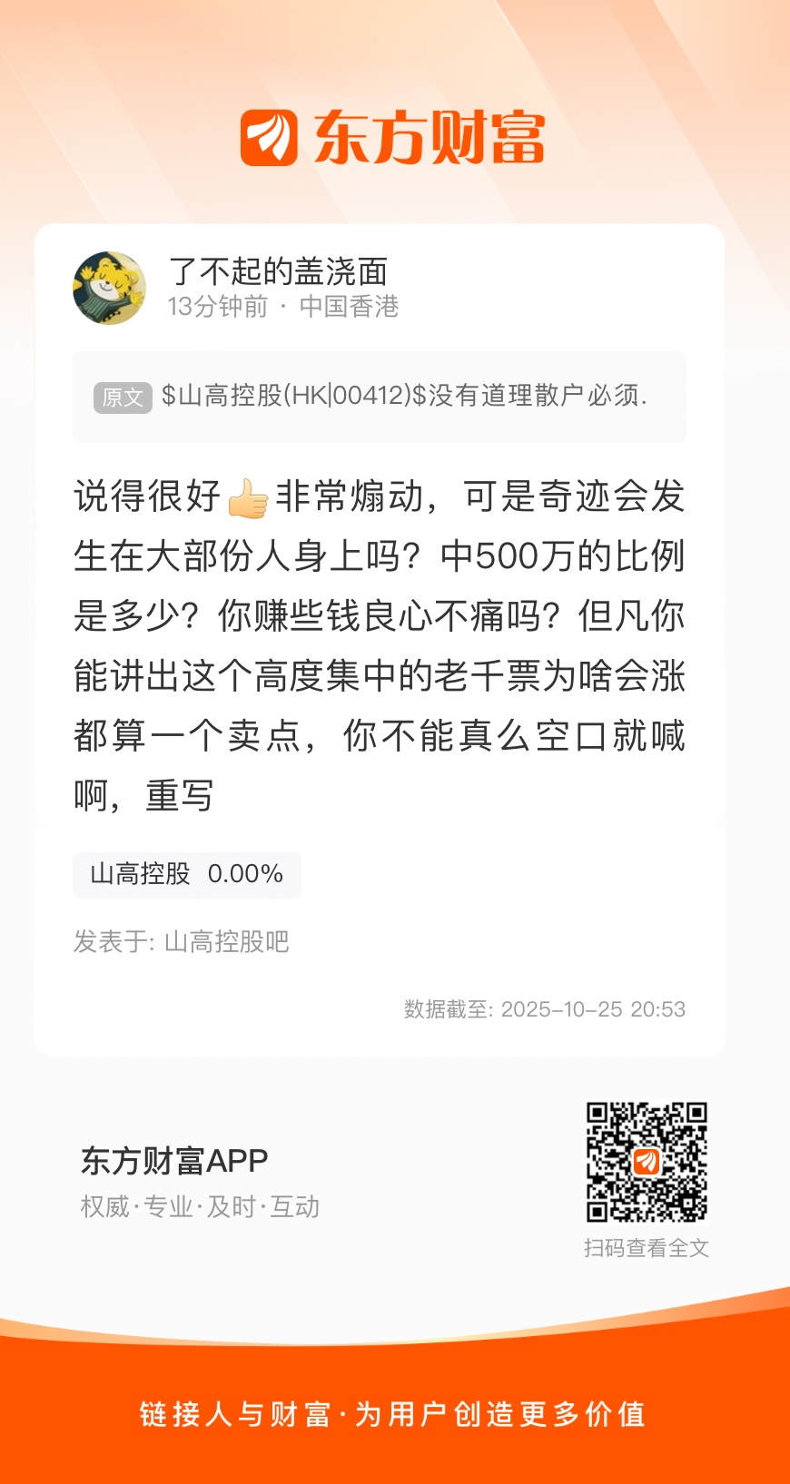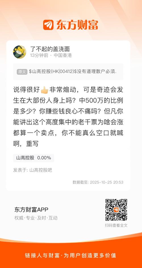 温馨提示: 1.根据《证券法》规定,禁止编造、传播虚假信息或者误导性信息,扰乱证券市场;2.用户在本社区发表的所有资料、言论等仅代表个人观点,与本网站立场无关,不对您构成任何投资建议。用户应基于自己的独立判断,自行决定证券投资并承担相应风险。《东方财富社区管理规定》