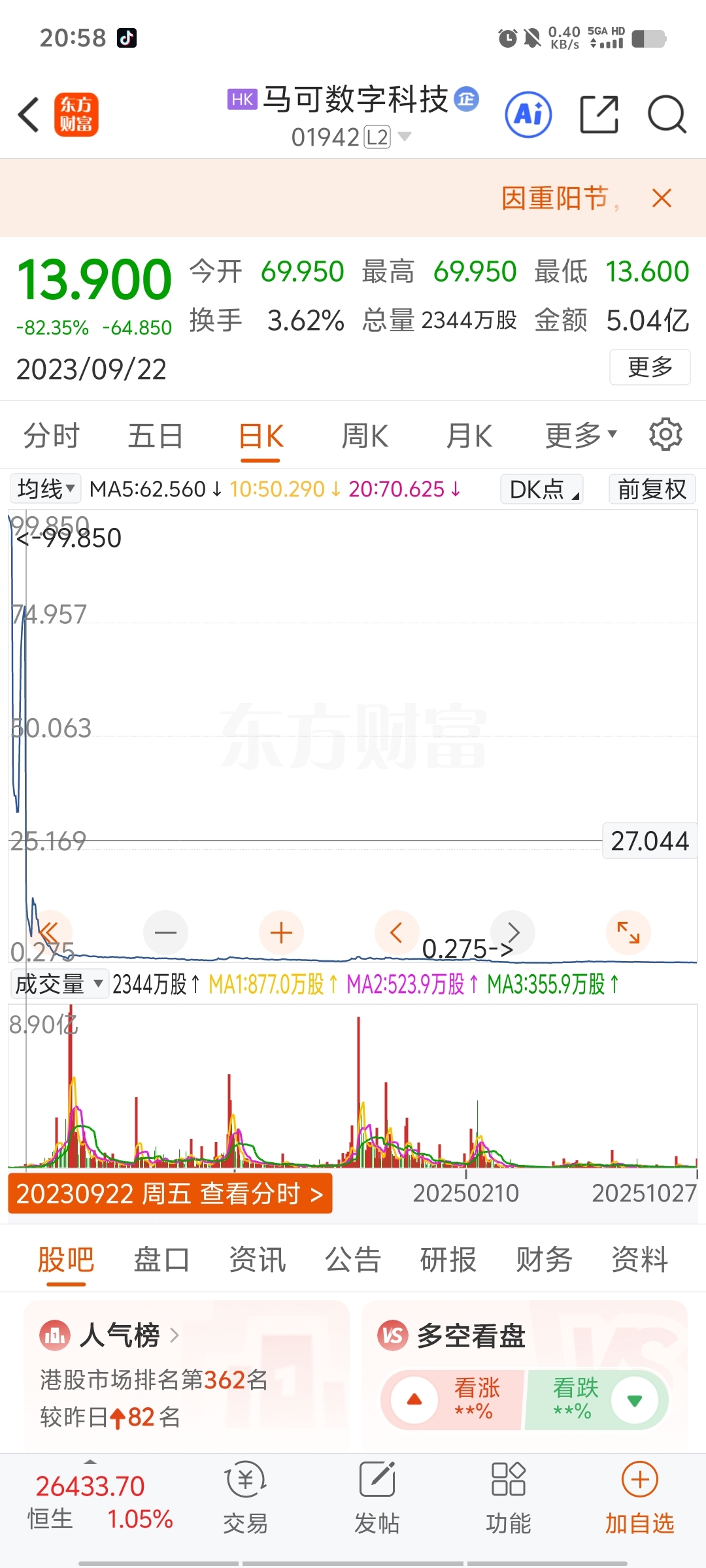$山高控股(HK|00412)$ 马可崩盘的时候成交量只有5个亿,而山高当天是60亿,然后又跌了一个月。 所以说论害人,所有老千股加起来都没有山高害的人多。
