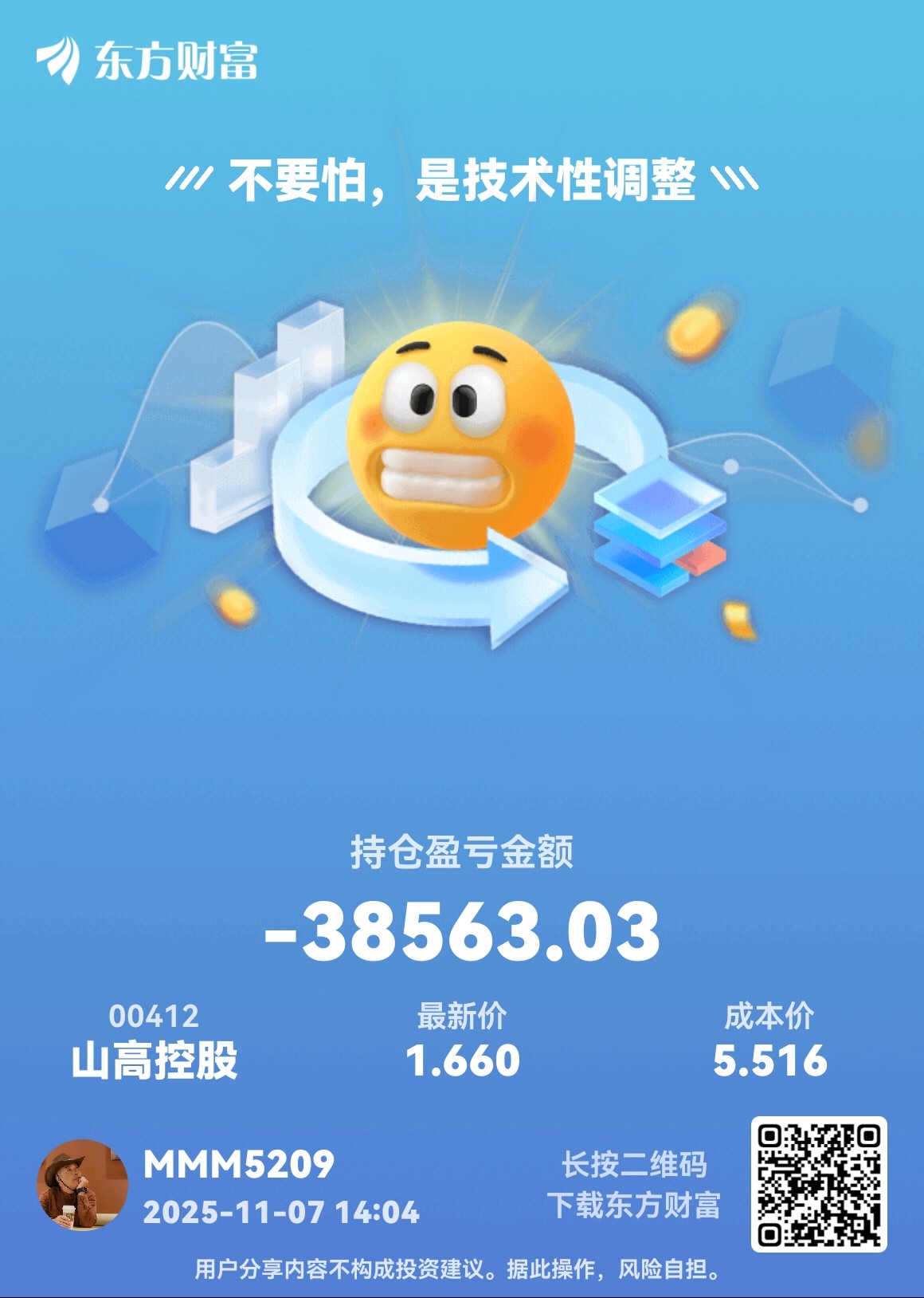 $山高控股(HK|00412)$ 5.5元的成本买了一万股,目前只有走两条路:(1)静待花开,公司如期回购,股价回升到9元(18元的一半),胜利大逃亡。(2)放着,当作反面教材,时刻告告诫自己同样的错误,不能犯第二次。如果能吸取教训,争取在操作上少犯错误,应该也是一种收获。