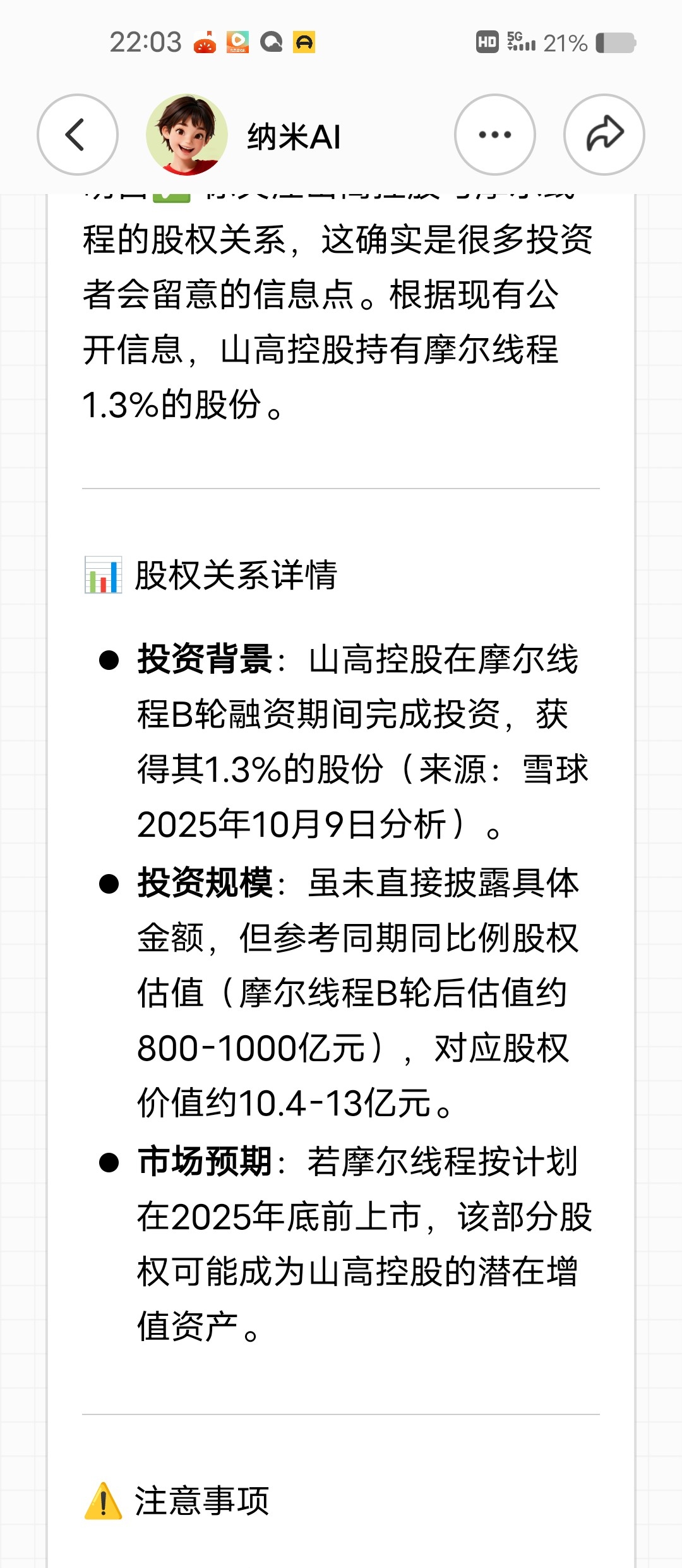 $山高控股(HK|00412)$ 摩尔线程快上市了,大家静心等待,虽然我最近买的已经卖了,港股通还有被套筹码,不挣钱那点货不卖!
