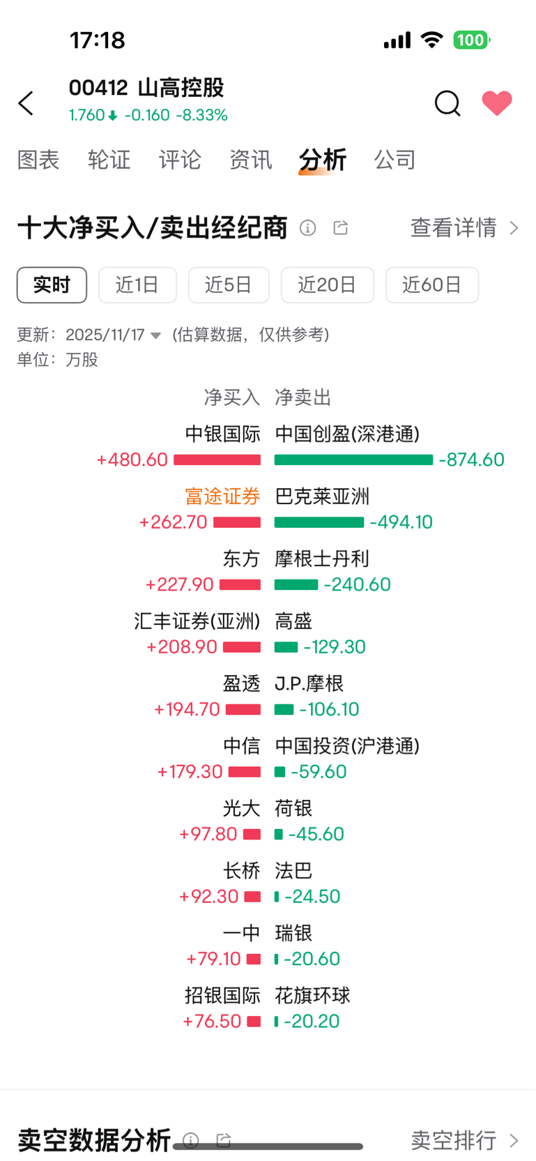 $山高控股(HK|00412)$ 中银国际席位是中央汇金,护盘了,港股通大割肉@毛驴老师