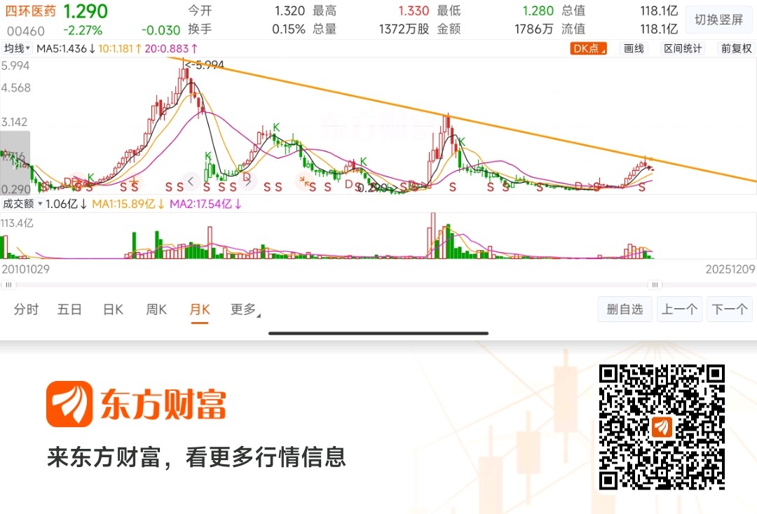 $四环医药(HK|00460)$ 严格按照这根线操作,等哪天突破了这条线就可以重仓了。现在被线压的死死的。