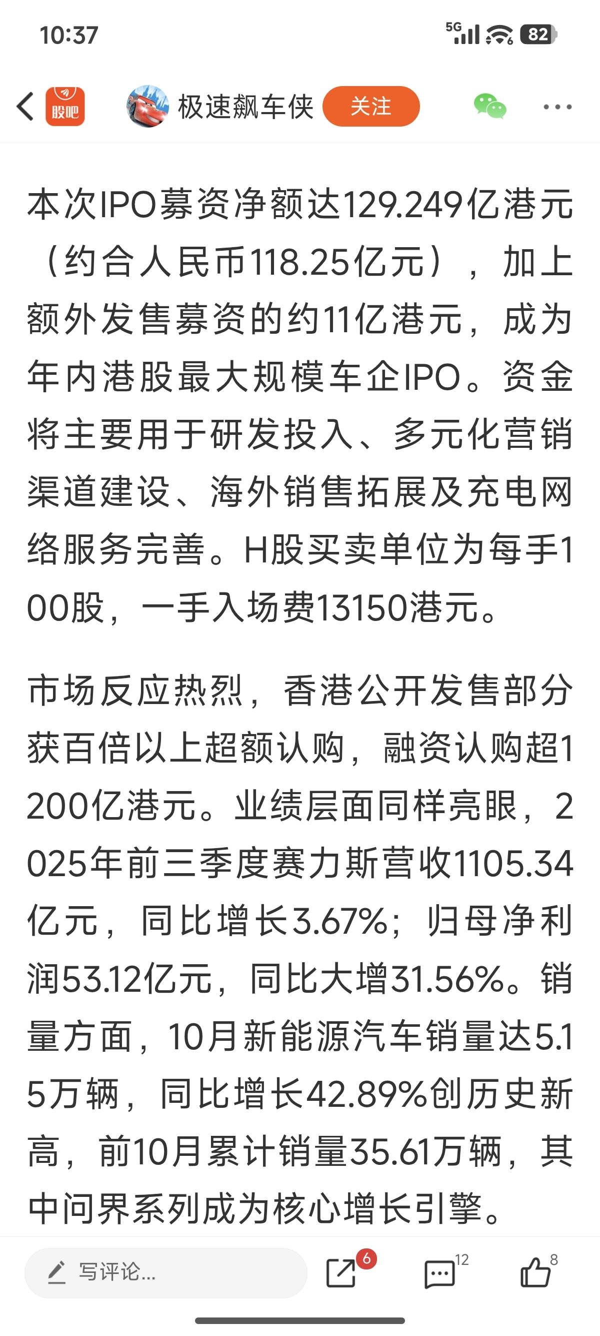 赛力斯港股获百倍以上超额认购,发行价比原定价格还高出好几块,目前市值2000多亿