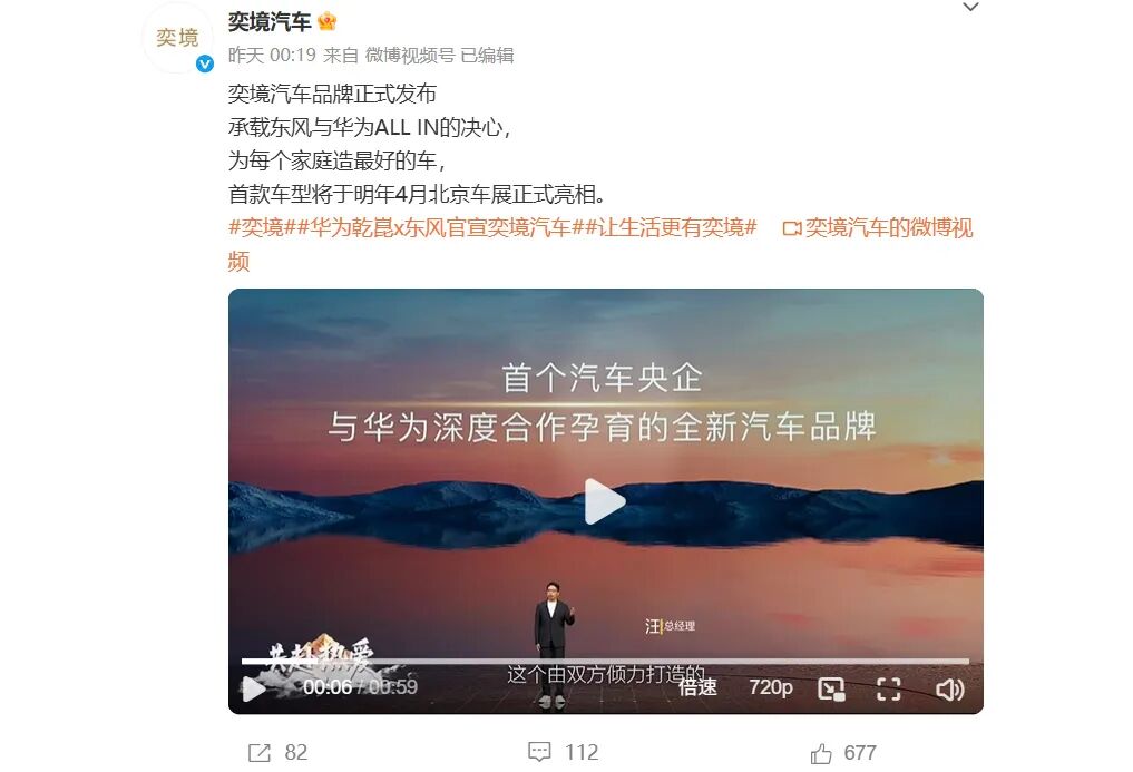 奕境官方微博账号已经注册,称“承载东风与华为ALL IN的决心”。