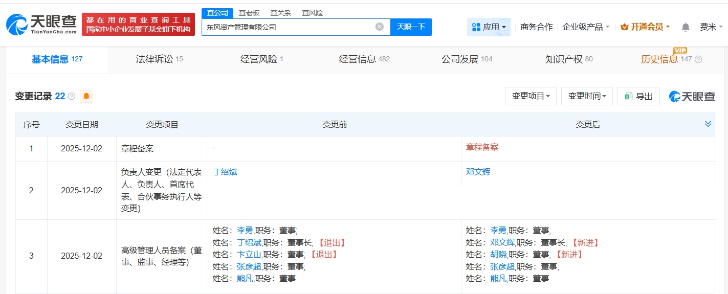 南方财经12月9日电,天眼查App显示,近日,东风资产管理有限公司发生工商变更,丁绍斌卸任法定代表人、董事长,由邓文辉接任,同时部分高管发生变更。该公司成立于2011年11月,注册资本8亿人民币,经营范围包括资产经营管理、投资、投资管理与咨询、土地开发及整理等,由东风汽车集团有限公司全资持股。据媒体报道,此前,东风资产管理有限公司召开干部会议,邓文辉任该公司党委委员、党委书记、董事、董事长。
