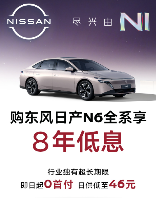 【大河财立方消息】2月4日,东风日产微博发布消息,对东风日产N6全系,推出8年超长期限低息车贷,0首付,日供低至46元,并称此为行业独有超长期限。