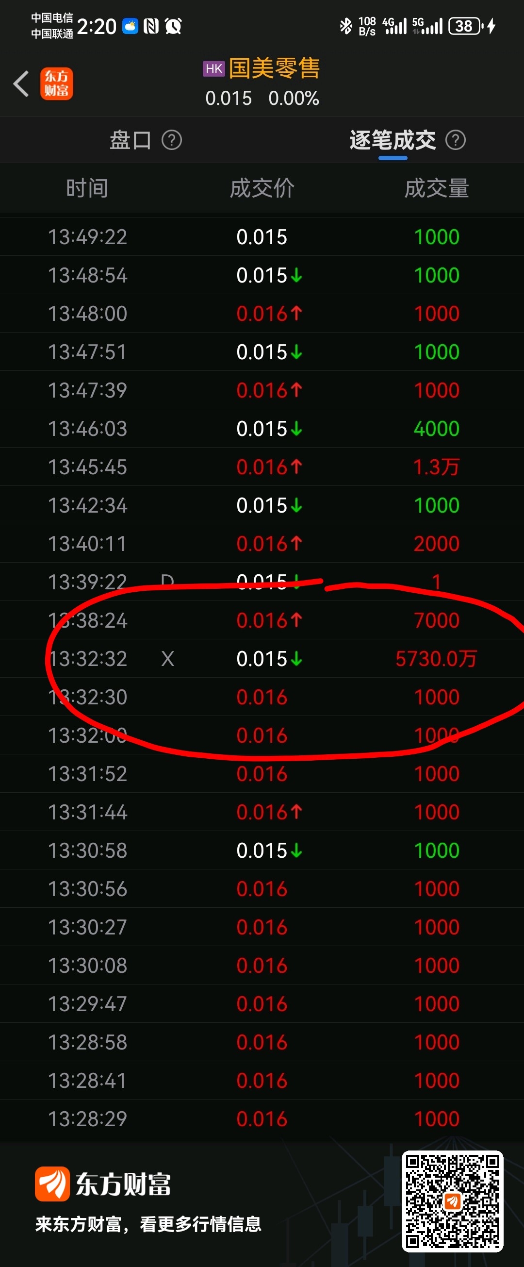 $国美零售(HK|00493)$ 下午一点半左右,有一笔5千多万股的同一券商非自动对盘交易是什么情况?大宗交易还是协商转让,也不知是在哪个券商完成的,跟光头有没有关系?