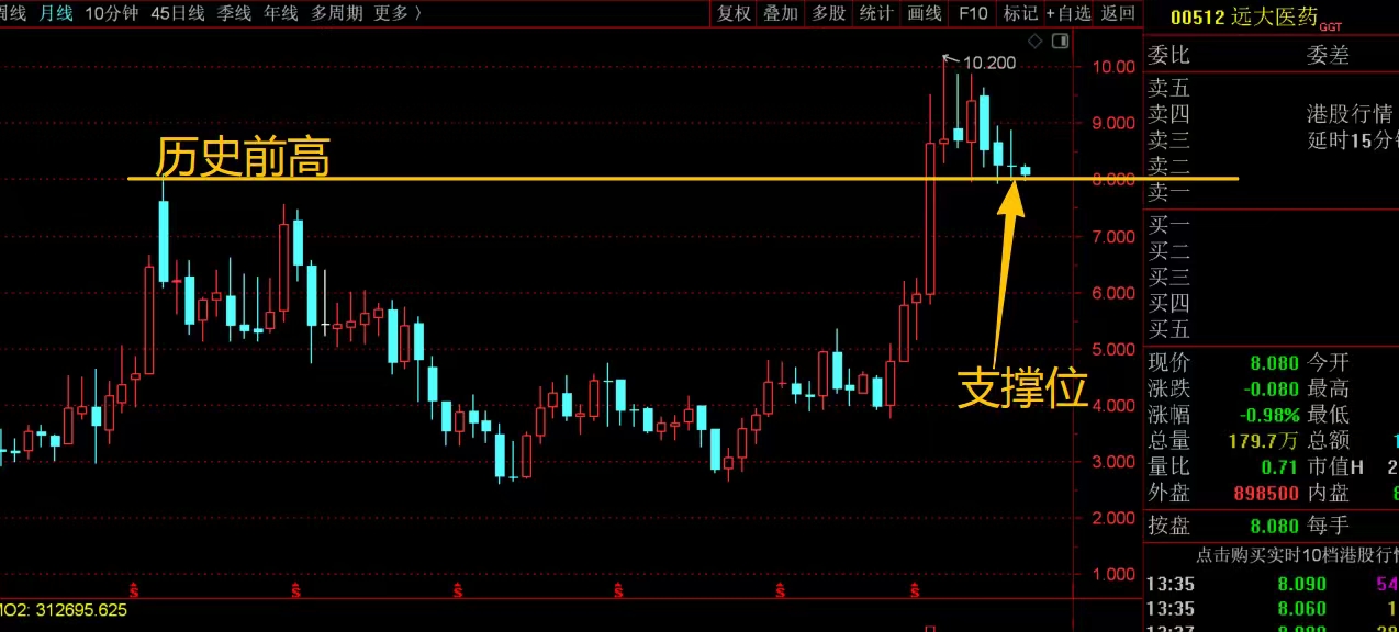 $远大医药(HK|00512)$ 正在做一个中短期的高位震荡调整,短线看不出什么名堂,我们可以重点关注月线,月线这里刚好回落到历史前高位置的支撑处8.11元附近,那接下来判断就比较简单了,只要能稳住这个支撑位,中期问题不大,但如果兜不住逐步回落跌破,就要减仓应对了,防着潜在的回落风险,等盘面有效站稳回支撑在再回补仓位也不迟,不用纠结。#复盘记录# #炒股日记#