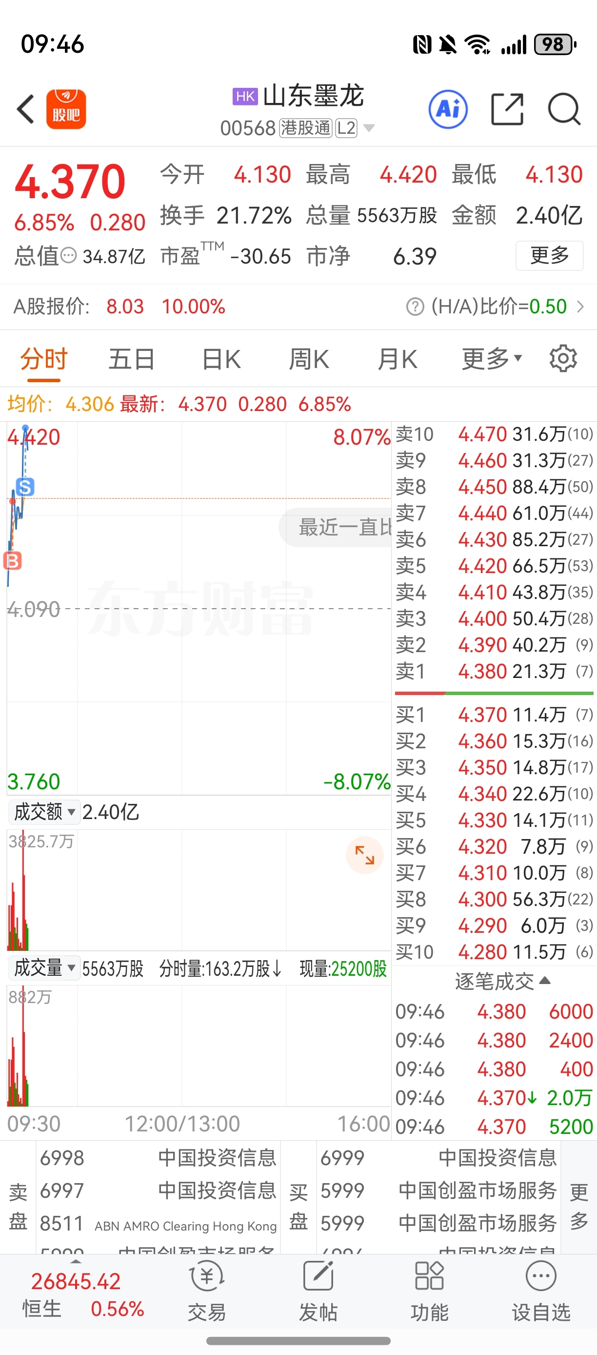 $山东墨龙(HK|00568)$ 感谢主力,4.41不贪心,走了先