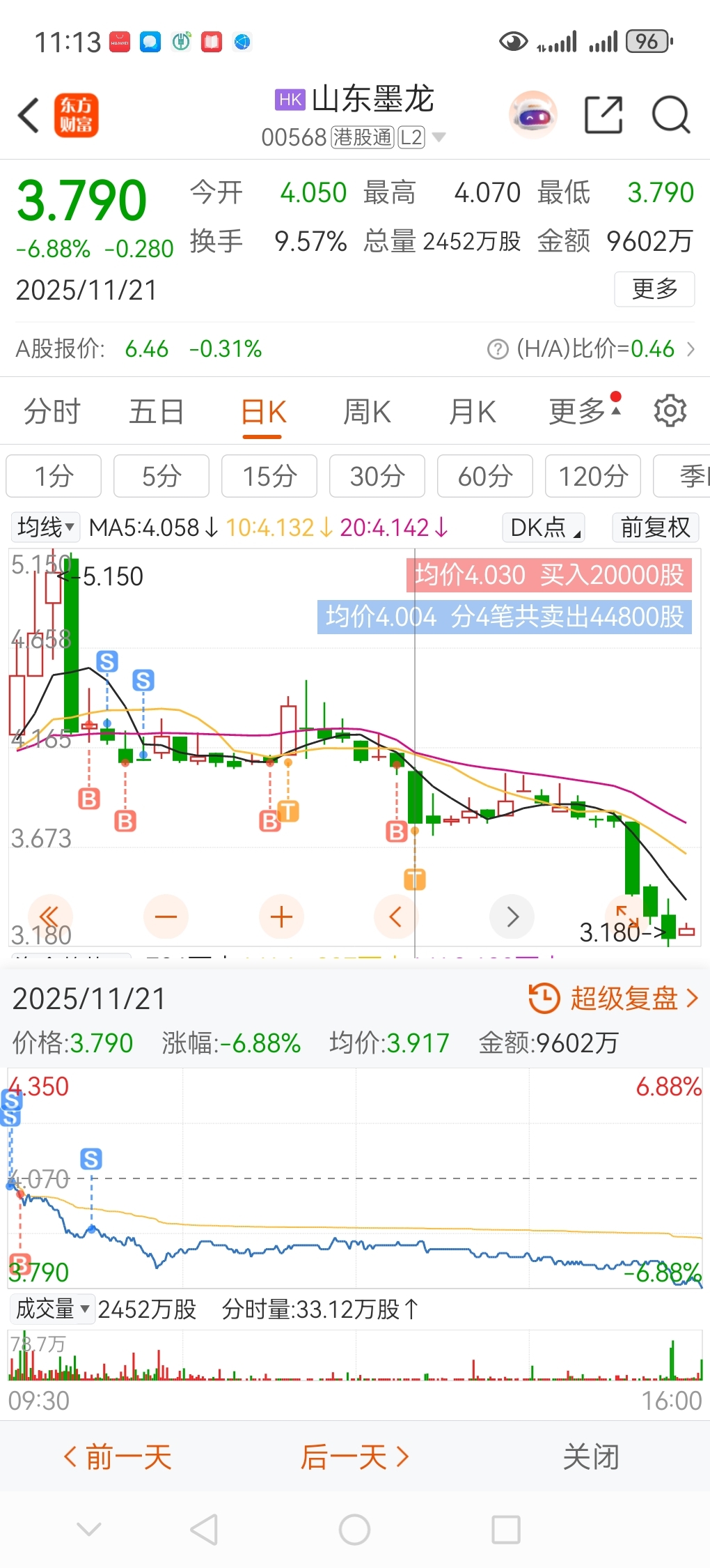 幸亏设置了四元止损,要不然这四万多股得亏近三万块