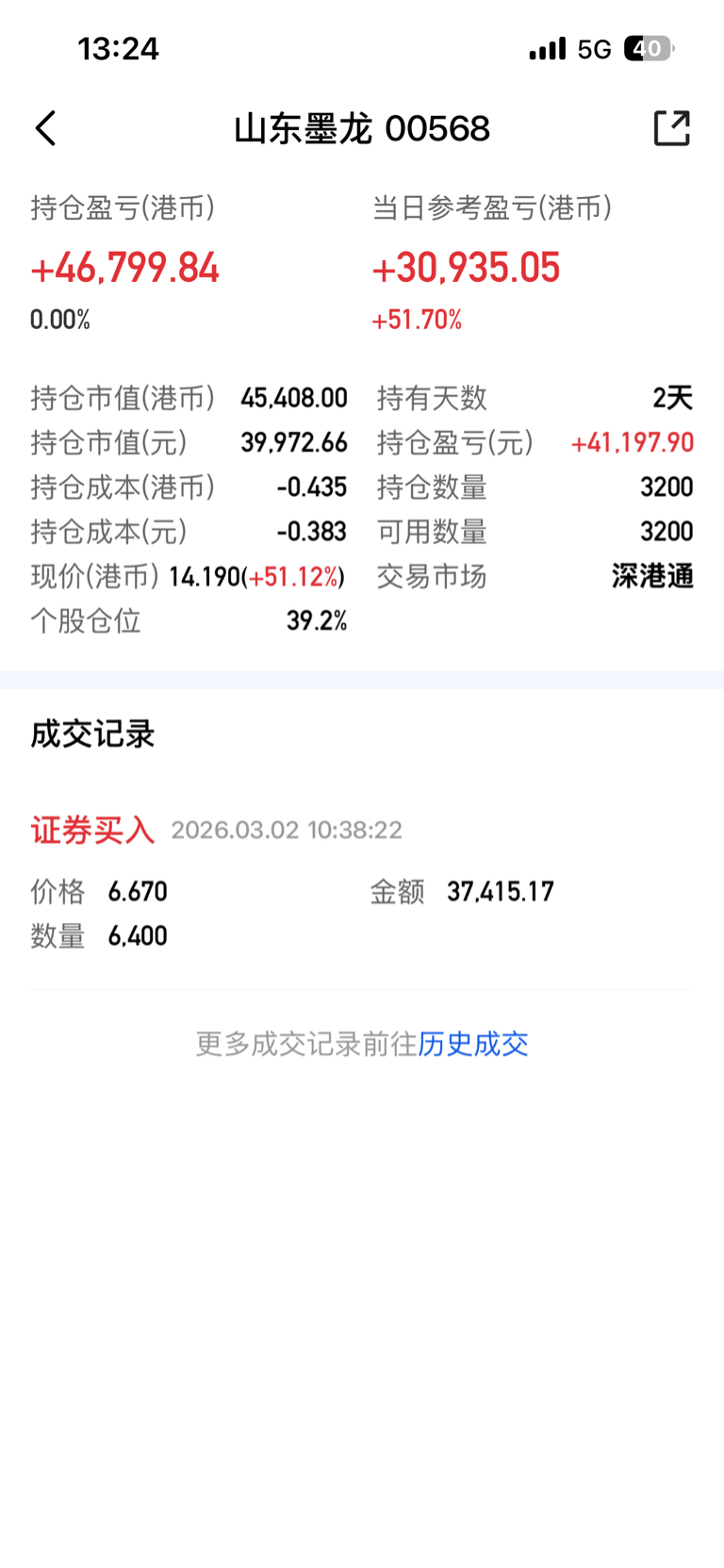 $山东墨龙(HK|00568)$ 昨天买了几万块钱玩玩,今天卖了一半。剩下负成本就放着去吧,大家元宵节快乐