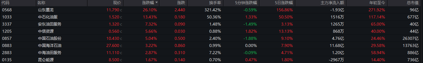 油气股大涨,山东墨龙涨超26%,中石化油服涨超13%。