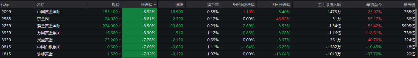 贵金属板块下跌,中国黄金国际、梦金园、紫金黄金国际、万国黄金集团跌超8%。
