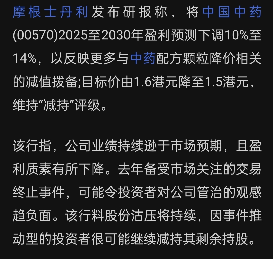 $中国中药(HK|00570)$ 其实摩根评价还是中肯的,他的理由是事件驱动的投资者还未出清。等个几年要改善业绩必然有动作,短期不管是机构还是股东都在等浮筹出清,去年是1.7确实摸一下被大股东拉起来了,今年可能预期更悲观一点