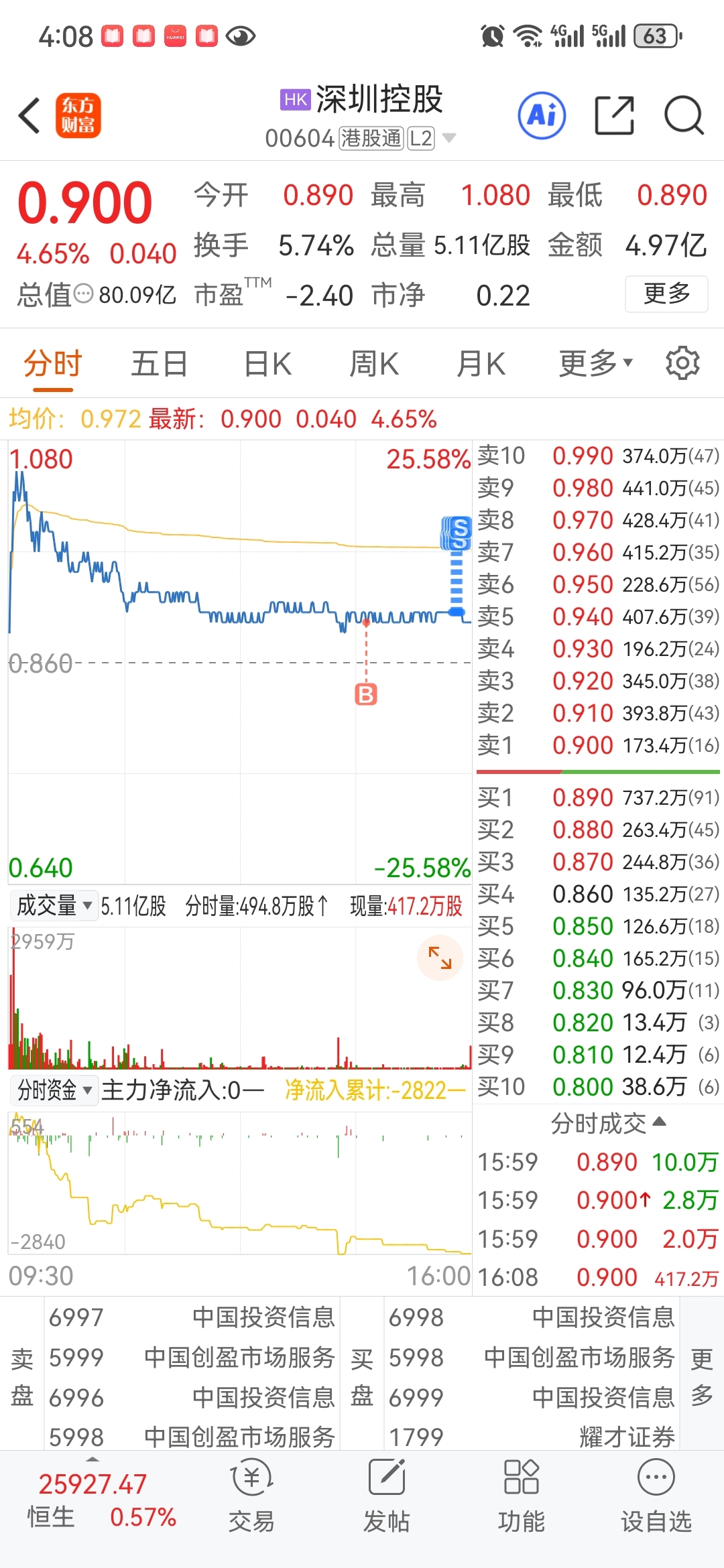 $深圳控股(HK|00604)$ 赚一分跑了,流动性太差,挂单1个多小时才成交