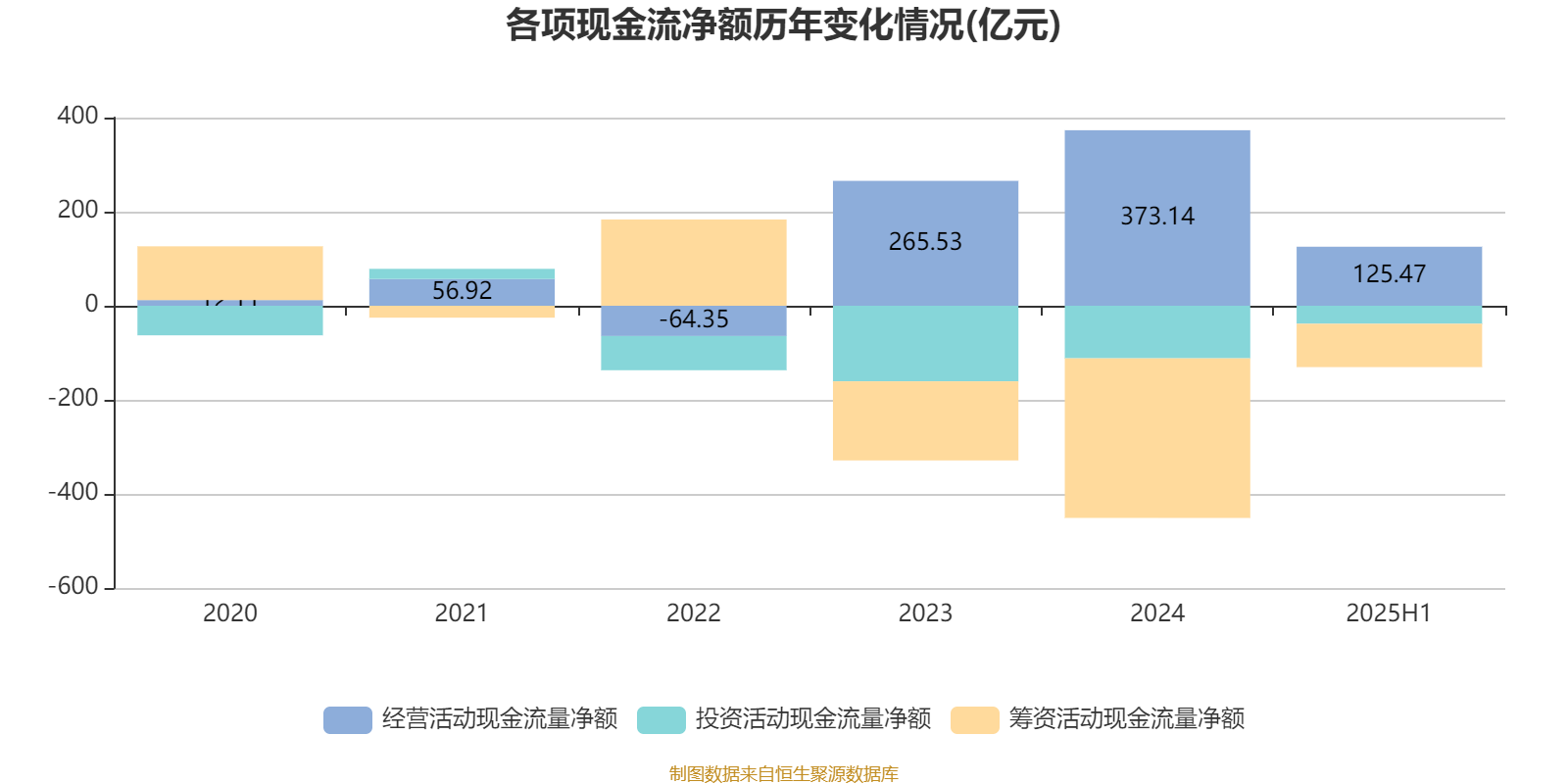 2025年上半年,公司经营活动现金流净额为125.47亿元;筹资活动现金流净额-92.15亿元;投资活动现金流净额-38.26亿元。