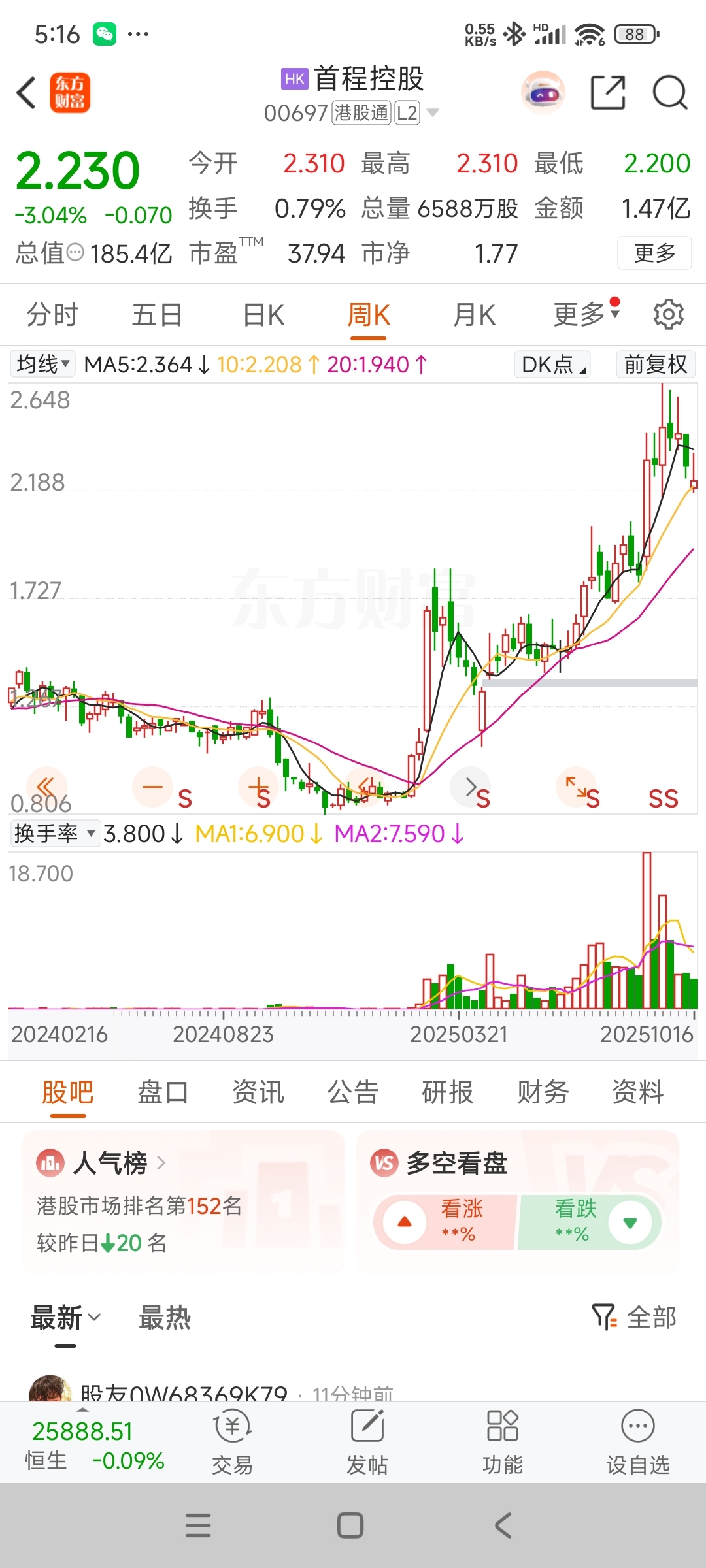 $首程控股(HK|00697)$ 周线三柱香,不死也重伤,能不能2.01止跌?看看一步算一步吧!