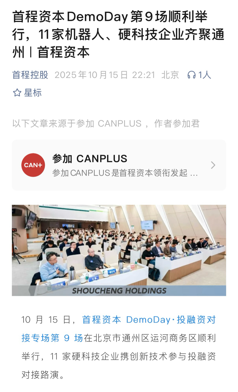 $首程控股(HK|00697)$ 首程资本DemoDay集聚AI for Science、智能制造、端侧AI机器人等创新项目,显示首程的前瞻布局能力。通州正在成为科技创新和产业转化的“前沿工场”,首程的资本布局正加速形成新一代硬科技集群。产业地位可见一斑