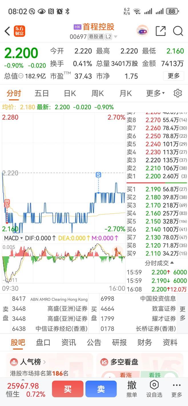 $首程控股(HK|00697)$ 今天只触发一笔成交,做T慢慢玩,不增加总体仓位,下跌就买,上涨就卖,除非主力给大阳线不卖,不然就不增加仓位,估计还要磨一段时间,估计月末了,天天自娱自乐,主力看到就抓紧拉吧,浪费大好行情,但我能等,坚定持有