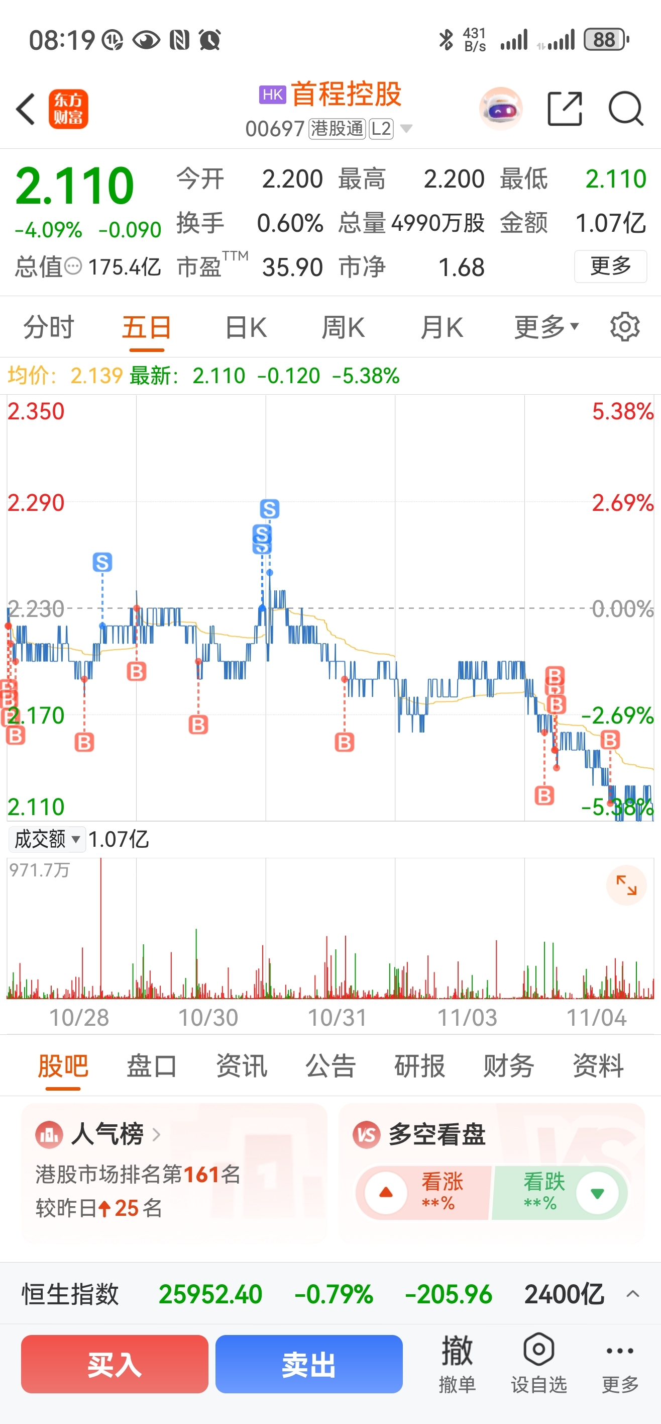 $首程控股(HK|00697)$ 这个位置只加仓,暂不卖出了,高于2.2考虑,明天继续加