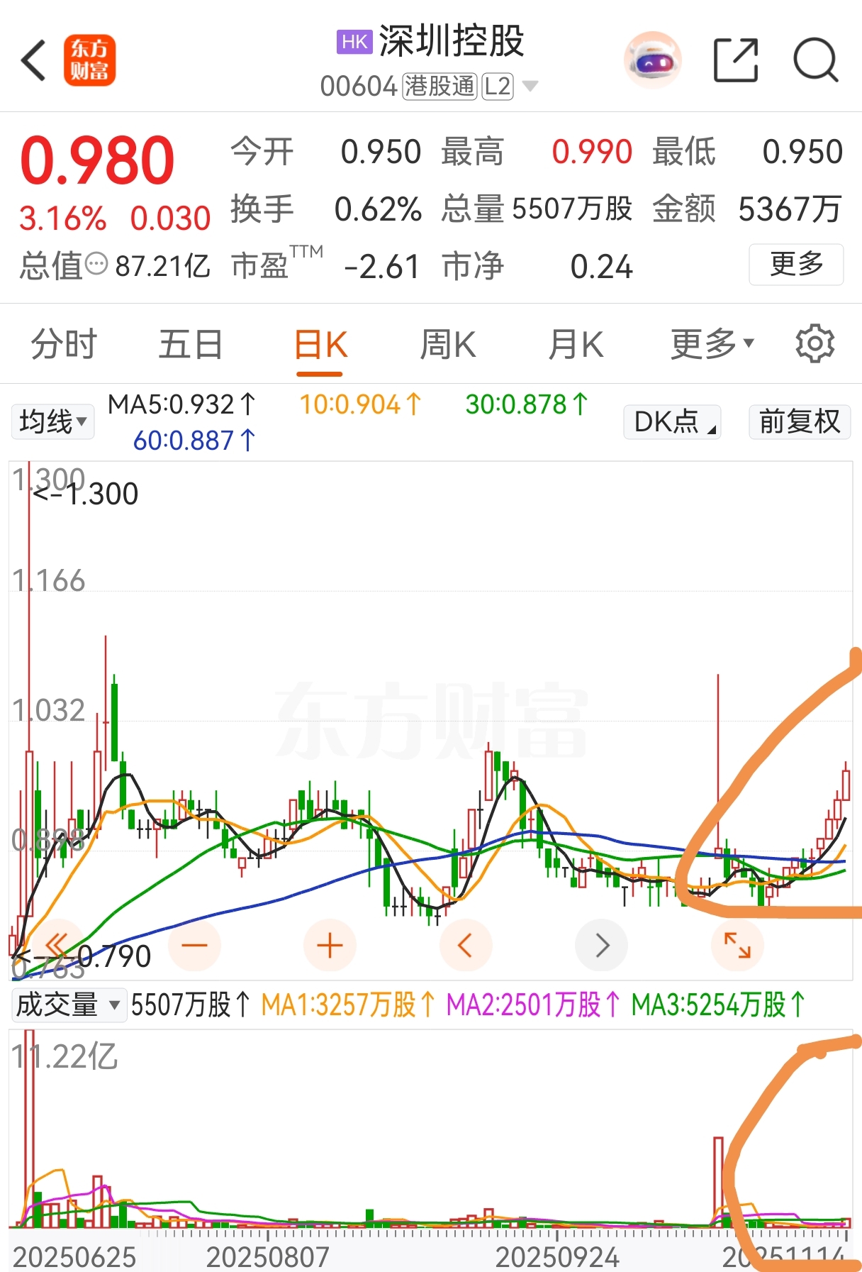 $首程控股(HK|00697)$ $联想集团(HK|00992)$ 老手们最喜欢的连续小阳待涨信号。来见证“免税+”、“地产+”双核驱动下大湾区跨境消费龙头股,深圳控股,在底部22亿资金完成双W筑底、连续5小阳吸筹后,如何小阳见大阳、逆势上涨、一飞冲天的。$深圳控股(HK|00604)$