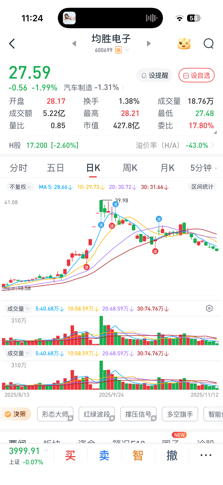 $均胜电子(HK|00699)$ 均胜25我全仓接,给个机会看看我,我在场外一直在等你到合适的位置
