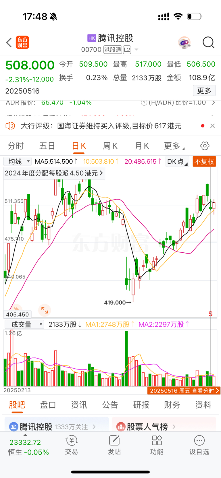 $腾讯控股(HK|00700)$ 昨天腾讯怎么跌两个多点,收盘不是才跌0.几个点吗