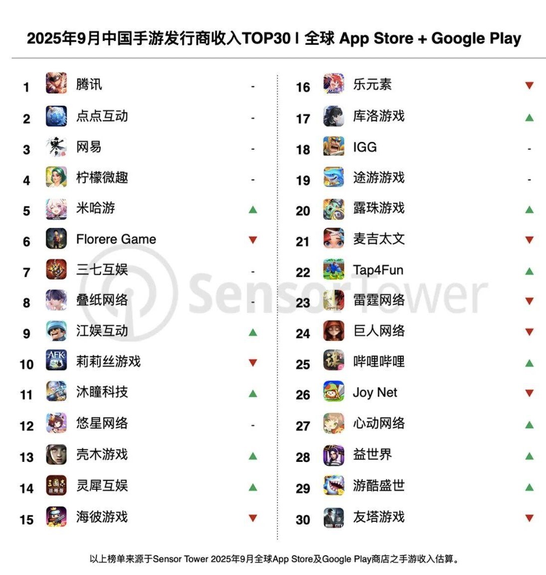 其中,腾讯战术射击手游《三角洲行动》于9月17日推出全新赛季“烈火冲天”,强势点燃玩家热情。游戏当日即登顶中国iOS手游畅销榜,并连续多日稳居榜首。得益于赛季热度带动,《三角洲行动》9月收入环比大涨76%,加之《王者荣耀》与《和平精英》等头部游戏的出色表现,腾讯稳居中国手游发行商收入榜之首。